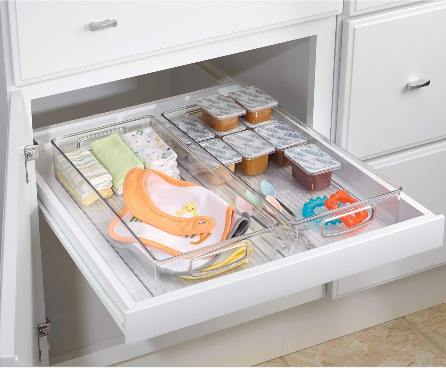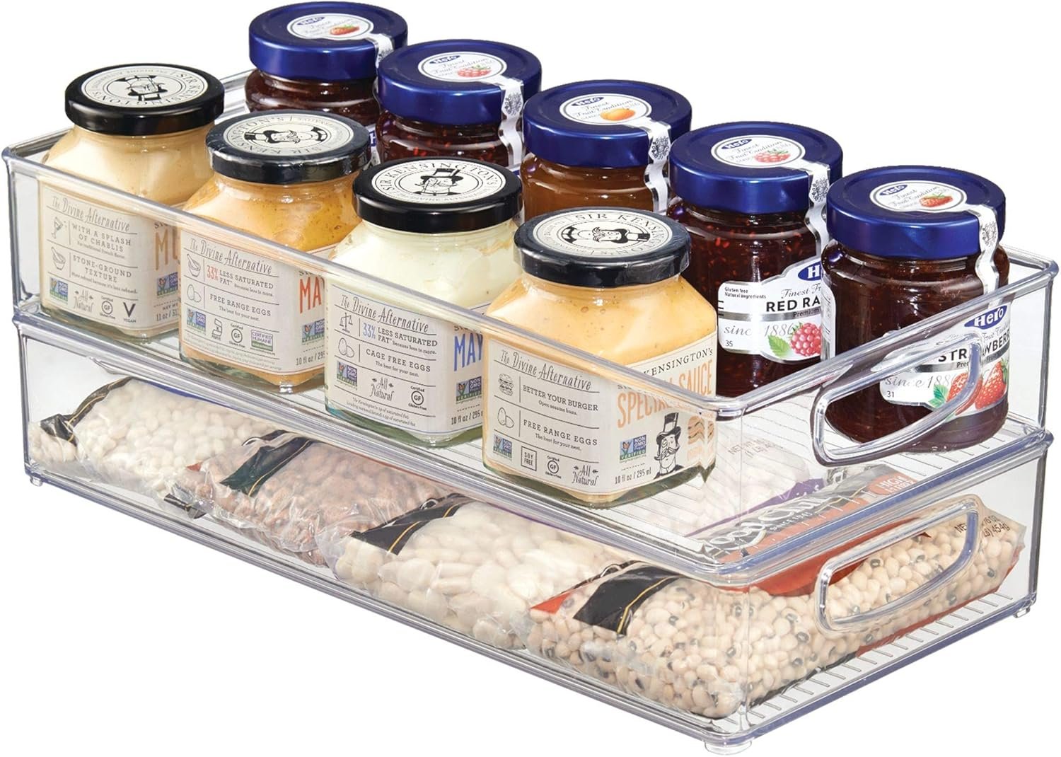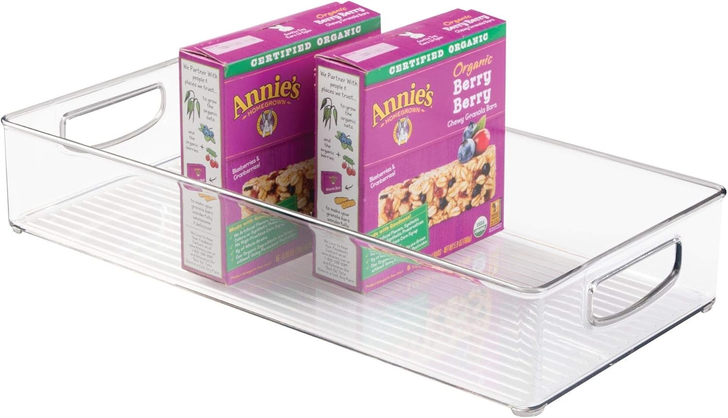 Upgrade your kitchen organization and storage with the iDesign Plastic Kitchen Storage and Fridge Organizer Bin. It’s a quick and easy addition to your pantry, cabinet, fridge, or freezer that will bring functional beauty and organized style. The versatile clear storage bin is ideal for use in the fridge and freezer to store produce, meat, cheese, drink boxes, food packets, potatoes, apples, onions, and more, or to store dry goods in the pantry and cabinet. Easily access or reorganize your items with the integrated handles on this fridge bin. The transparent design of the clear organizing bins ensures items are always visible and accessible. Measuring 16” x 8” x 3”, the food storage container is just the right size to store food in your fridge, freezer, pantry, or cabinet. Use several as clear storage bins to store kitchen utensils and tools, cleaning supplies, cosmetics, and crafts, or for extra organization in your closet or laundry room.Made with durable BPA-free clear plastic, this kitchen storage container stands up to everyday use. With iDesign, you can live simply and sustainably every day.