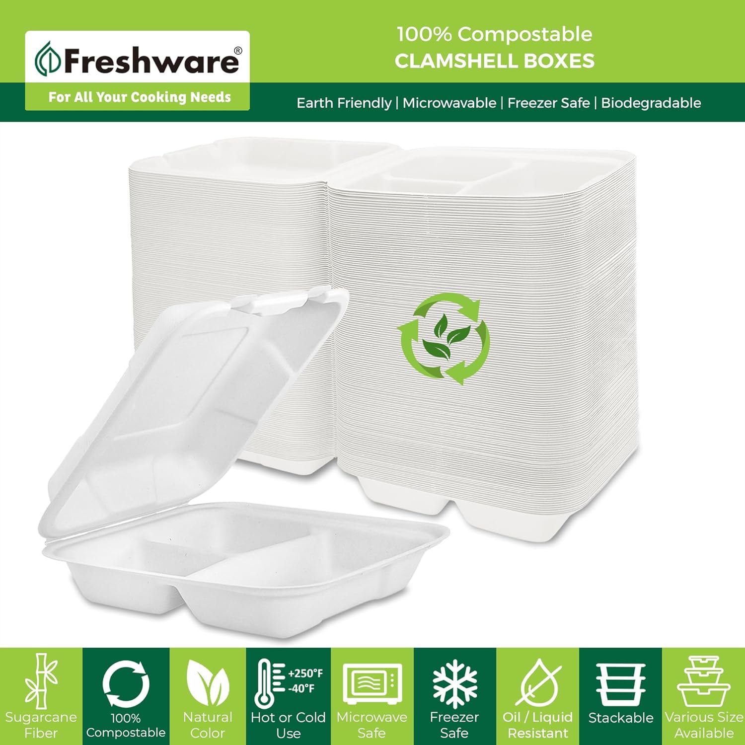 Introducing our Freshware 8 x 8 Inch 3-Compartment Compostable Clamshell Take Out Food Container with Hinged Lid – an ideal choice for serving hot or cold food with convenience and sustainability in mind. Whether you're catering daily meals, running a restaurant, managing food trucks, handling to-go orders, or organizing special events, these disposable paper to go plates are designed to meet your diverse food service needs. Crafted from 100% Sugarcane Fiber, a sustainable, renewable, and biodegradable material, these to go paper food containers present a fantastic alternative to traditional paper or plastic options. Not only do they offer the same sturdy functionality and easy cleanup, but they also stand out as a zero tree and plastic-free choice. Our environmental commitment continues as these serving bowls are 100% compostable. Made from Sugarcane Fiber, they can be commercially composted, eliminating the need for landfill disposal. This ensures a quick degradation process, providing a convenient cleanup solution for you, your customers, and the planet. Our product adheres to the highest industry standards and is intended for composting in municipal or commercial facilities following best composting management practices. Versatile in use, these bowls are suitable for both hot and cold food items, providing reliable strength without any plastic or wax lining. They are also microwave and freezer-safe, as well as oil and cut-resistant, ensuring durability in various situations. Elevate any occasion with Freshware's Compostable Clamshells Food Storage Containers. With a diverse product range and a timeless design, Freshware guarantees premium, all-natural organic tableware for your family, friends, or any event. Whether you're planning a camping trip, picnic, lunch, catering event, BBQ, party, wedding, or managing a restaurant, these bowls offer the perfect blend of convenience and eco-friendliness.