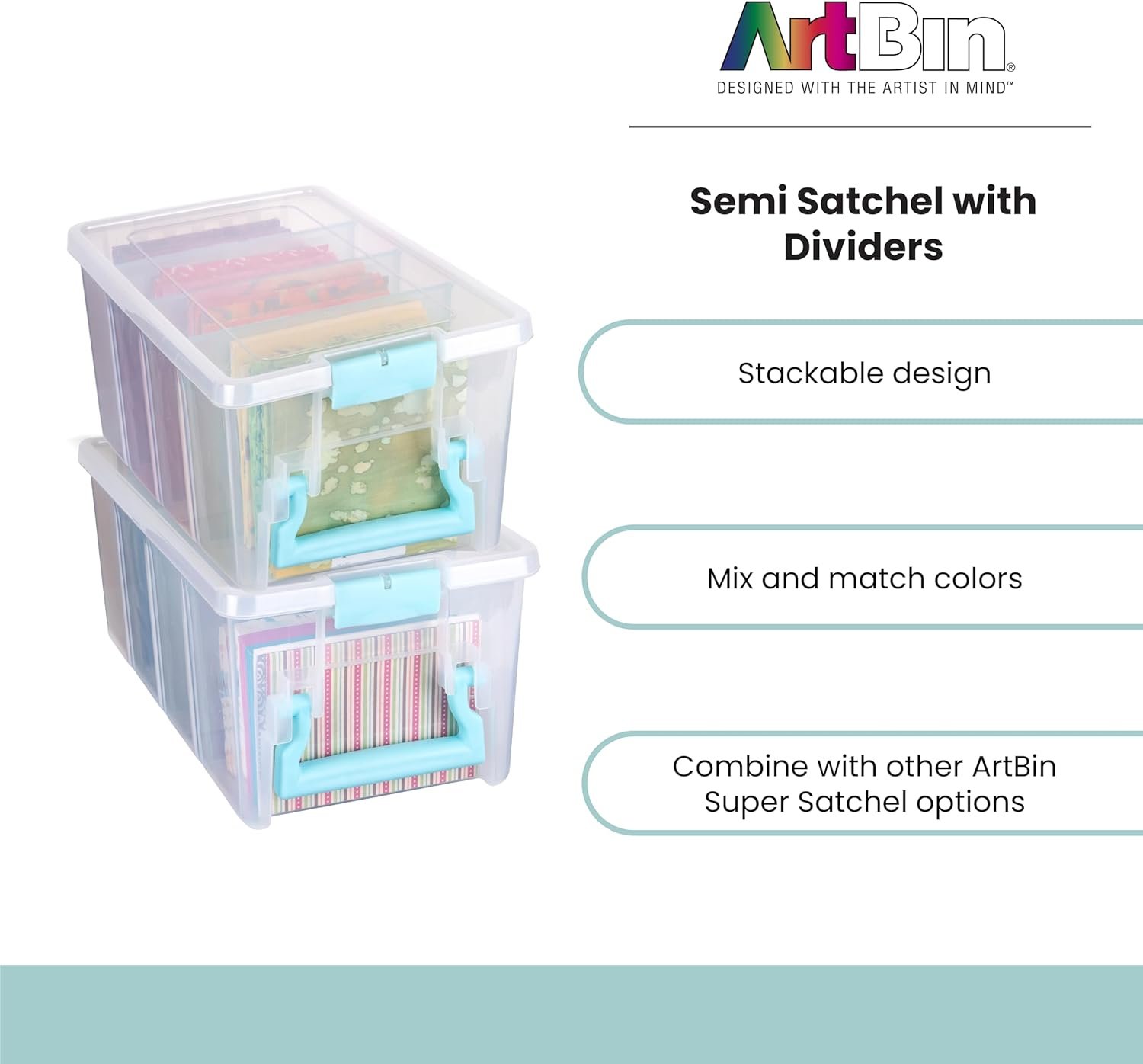 Introducing the ArtBin Semi Satchel Box – the perfect storage companion for your art and craft supplies. Made from durable polypropylene, this organizer ensures long-lasting use, ideal for your crafting needs. Designed with secure snap-tight closures and a convenient handle, it's a top choice for artists and crafters. The clear design allows easy visibility, with color accents adding sophistication.Measuring 15.2 x 8 x 6.2 inches, it features a single compartment with rounded edges for protecting scrapbooking papers. The depth accommodates bulkier supplies, keeping everything neat. Customize with three removable dividers to suit your storage needs for card stock, photographs, embellishments, and more.The smart closure system keeps contents secure during transport, and the plastic handle ensures easy carrying. Stackable with other containers, it maximizes storage space. Compatible with ArtBin accessories like 6939AB, 6814AG, and 6951AB, it offers a complete storage solution.Invest in the ArtBin Semi Satchel Box for a clutter-free crafting experience. Order now for an organized and efficient storage solution.