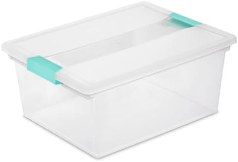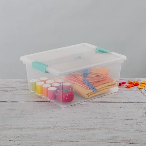 LATCH CLIP BIN: Organize your home and keep clutter-free with the Sterilite deep stackable storage containers with clear lid and blue aqua hinged latch clips