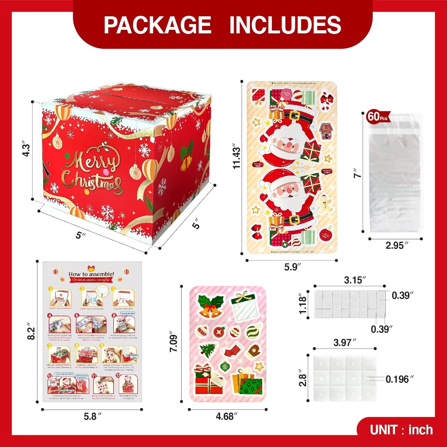 Package Includes - 1 Christmas gift money box, 1 Merry Christmas card, 22 accessories, 12 glue point, 60 transparent OPP bags, 1 instruction manual.