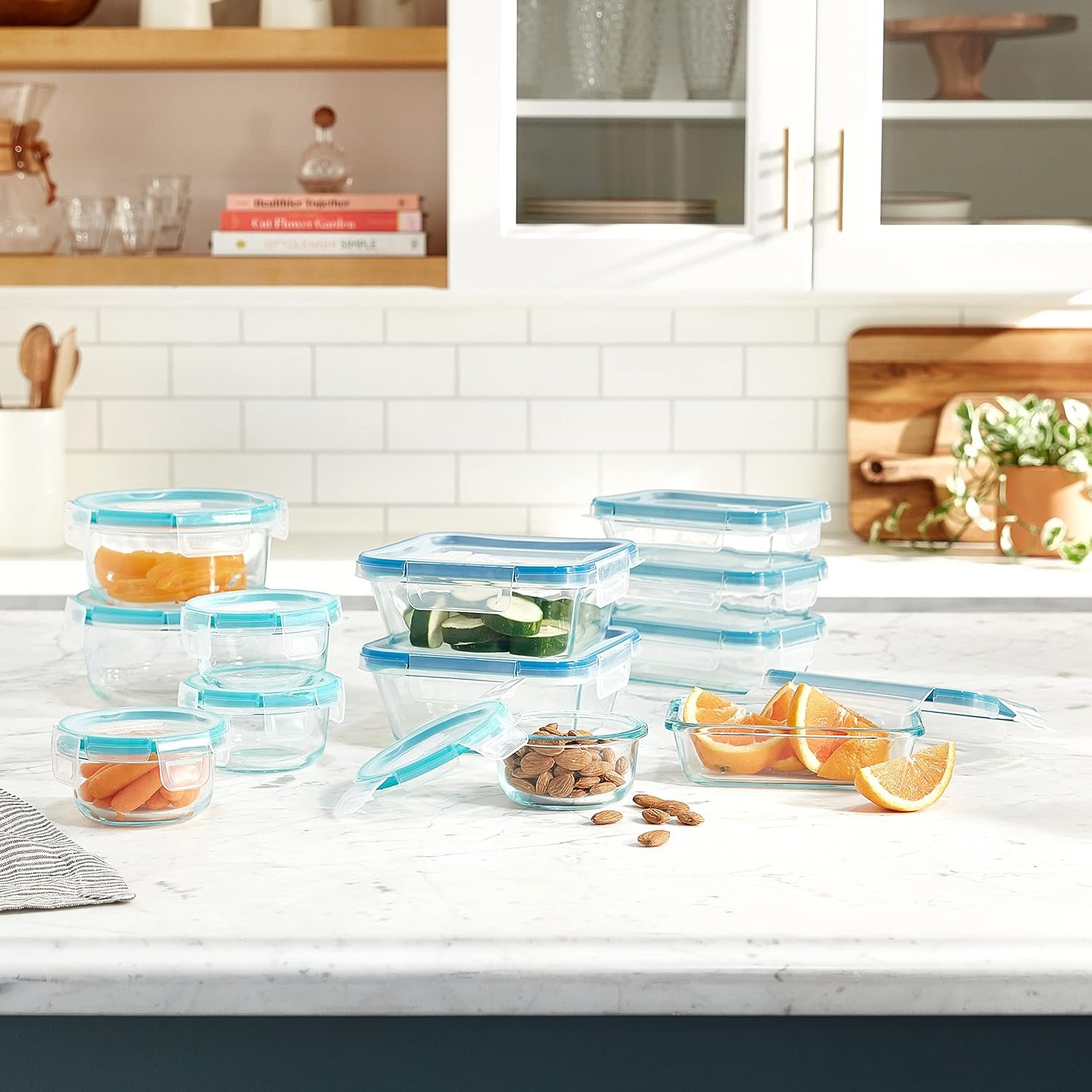 The Snapware Total Solution Glass Food Storage Set combines four-latch plastic lids with oven-safe glass containers for storing and organizing food and other items in your home. Snap Lock lids have a silicone seal for secure, air-tight and leak-proof seal that keeps food fresher longer. Easy open, close tabs ensure a secure and lasting closure you can see. Long-lasting glass containers are dishwasher, microwave, refrigerator, and freezer safe. Lids are BPA-free and top rack, dishwasher safe. Container is also great for storing and carrying other household items like tools, toys and other small items. Space saving, nestable design allows containers to stack easily for storage. Lids fit both glass and plastic Snapware containers for convenience. Set includes two (2) each of 4-cup square and 4-cup round, with four (4) each of 1-cup round, and 2-cup rectangle with Snap Lock plastic lids.