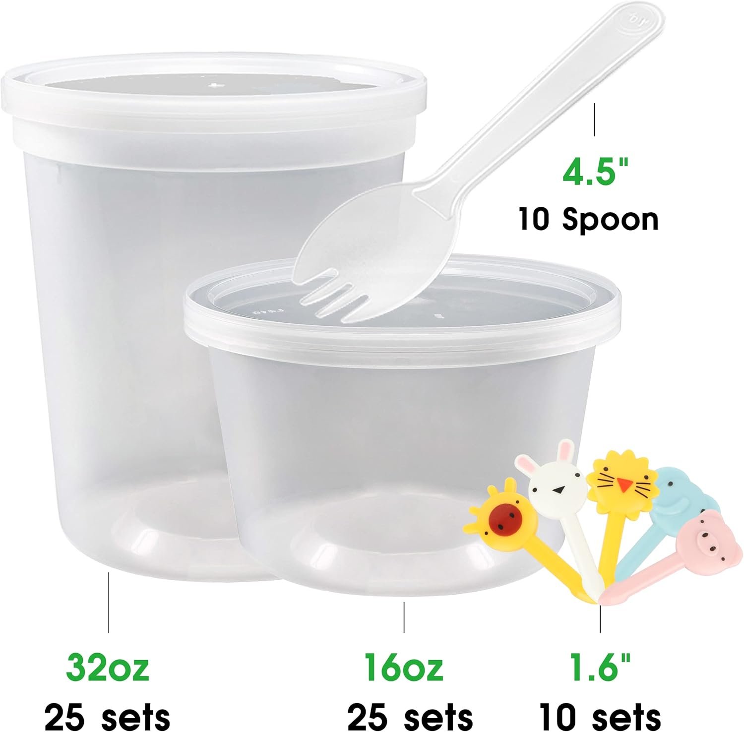 BULK PACK OF 50+ 20 SETS: Package with 2 sizes 50 Round Containers with lids &10 spoons & 10 mini fork. Convenient16oz x 25 sets + 32 oz x 25 sets Food Storage Containers. Lids are one size and fits all, so you don't have to worry about searching for the right lid. Excellent choice for packaging leftovers, pre-made foods and even raw ingredients.