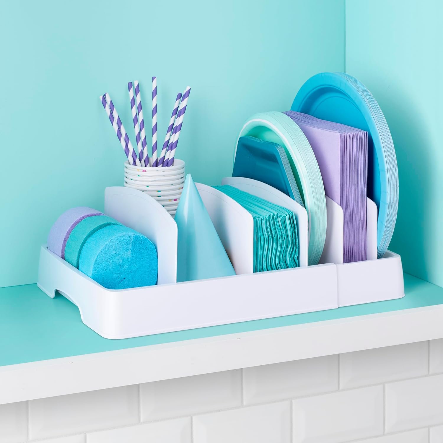 Cleans up cluttered container lids for an easy win! No more digging around the cabinet to find a lid that fits–they're all in one place and neatly organized with StoraLid® Container Lid Organizer. The sturdy base expands from 13.5”-22.5” to fit any drawer, cabinet, or pantry. Sturdy, adjustable dividers create customized spacing, so lids of various shapes and sizes stay upright and sorted the way you like. StoraLid® is great for kitchen cabinet organization of reusable bags and wraps, napkins, paper plates, and children's dinnerware too. With the Expandable StoraLid®, food storage stays organized so you can pack leftovers in a snap.