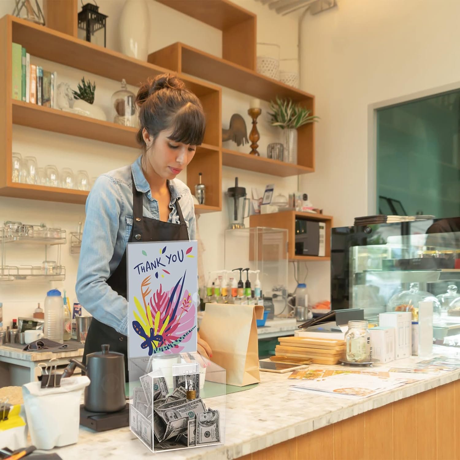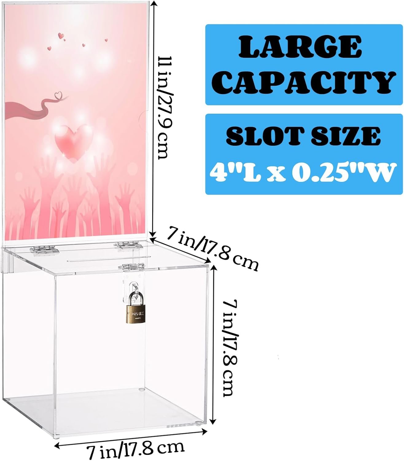 YOUEON acrylic donation box with removable display holder and a lock with key measures 7"L x 7"W x 7"H, the slot size is about 4"L x 0.25"W, and the display holder measures 11"H. Made of high quality clear acrylic, shatter-resistant, lightweight and durable