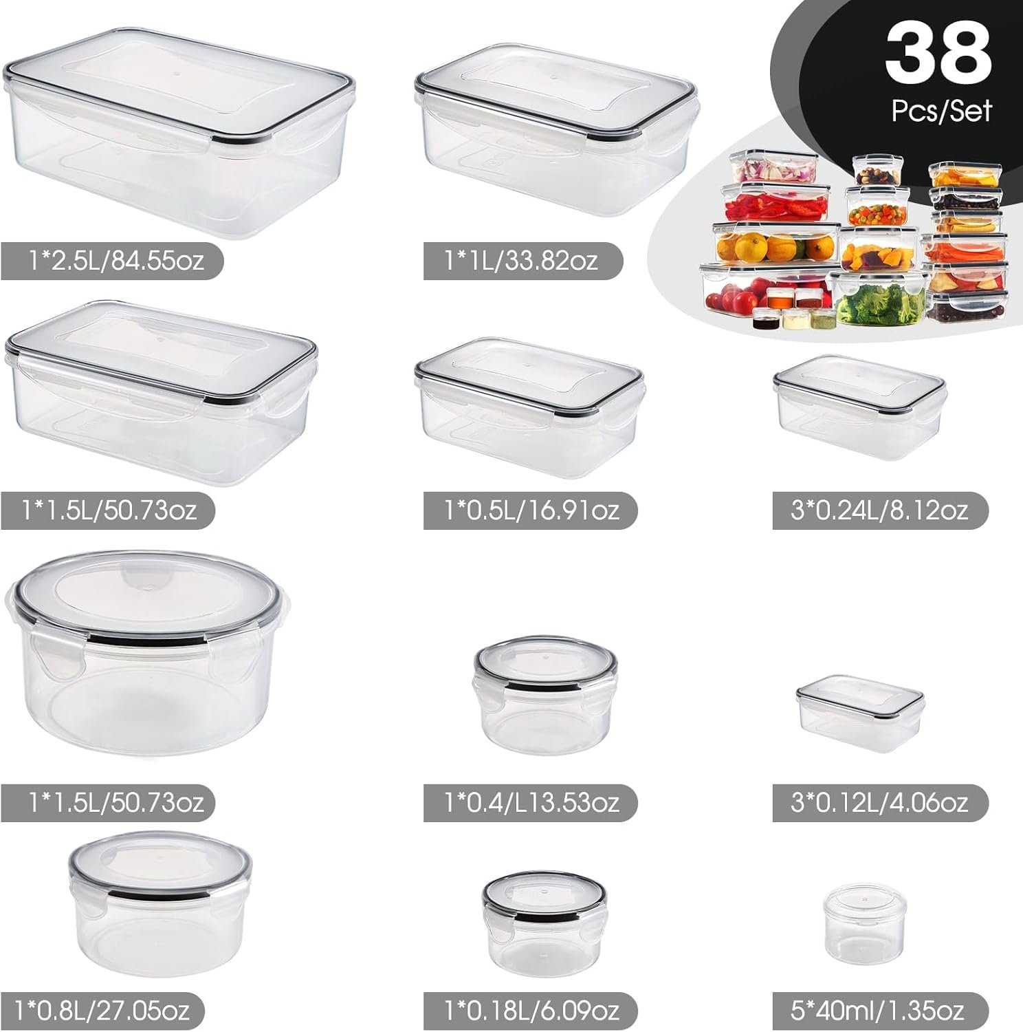 VERSATILE SIZES: 38PCS- Plastic food containers set include 10 rectangular containers(3*4.06oz, 3*8.12oz, 1*16.9oz, 1*33.82oz, 1*50.73oz, 1*84.55oz), 4 round containers (1*6.09oz, 1*13.53oz, 1*27.05oz, 1*50.73oz), and 5 sauce containers (5*1.35oz), they all have corresponding lids. Perfect food containers for storing various foods and condiments