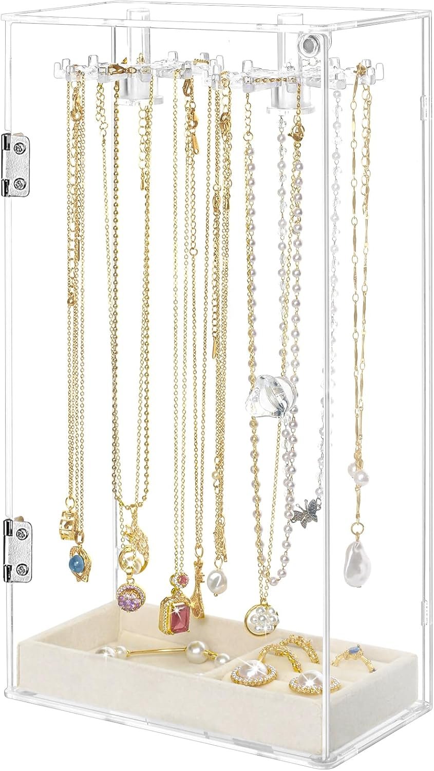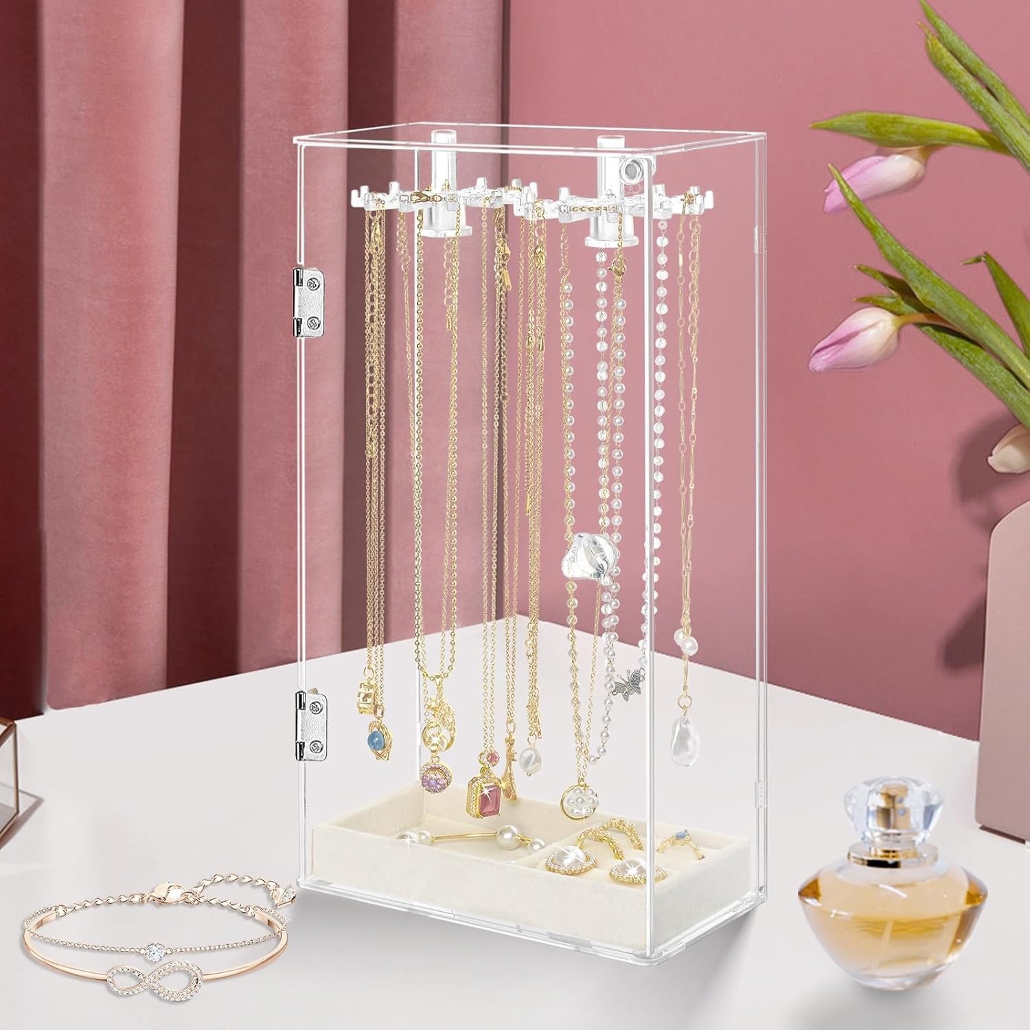Acquista all'ingrosso Portaoggetti per collane, Organizzatore per gioielli in acrilico antipolvere, 24 ganci per collane, contenitori per pendenti, espositore per bracciali, scatole per gioielli con vassoio in velluto per orecchini e anelli, provenienza dalla fabbrica