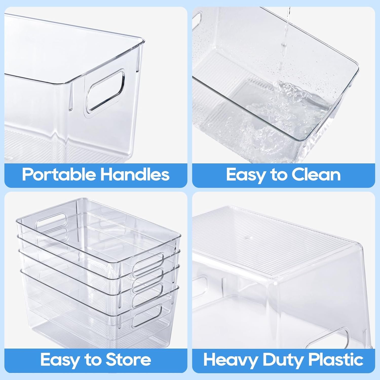 Made from durable plastic, these clear plastic storage bins are perfect for storing various items while keeping them easily visible. Whether you need to tidy up your pantry, organize your Kitchen, Refrigerator, Bathroom, closet, or Office, or declutter your garage, our Organizer Bins are the ideal solution