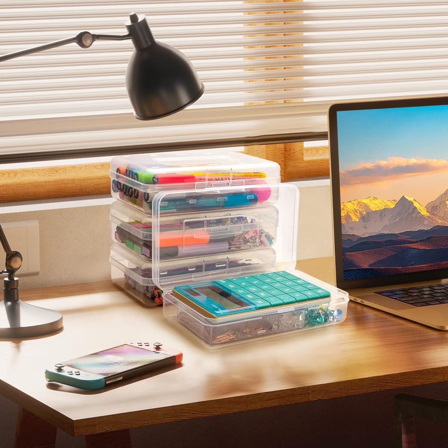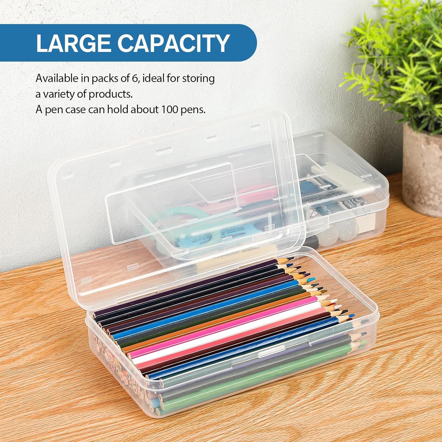 LARGE CAPACITY LASTIC BOXES: Measures 8.2 by 4.7 by 2.3 inches. These plastic cases are roomy, holding more than 100 pencils, 50+ pens, and 30+ markers. A 6-pack storage organizer box is perfect for you to organize your trivial items.