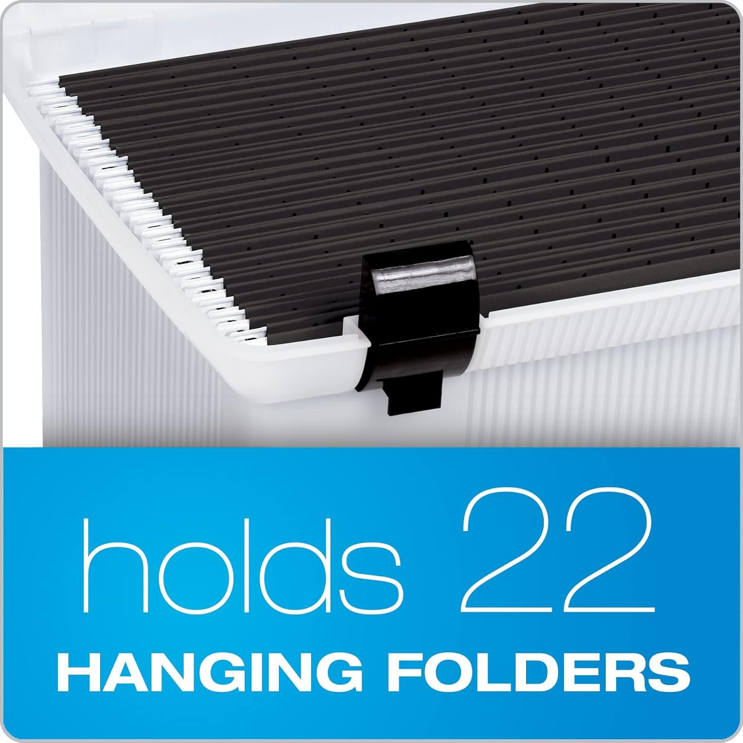 Create a quick & easy portable file system; this slightly translucent plastic file box has a hinged lid with double latches; file rails hold up to 22 folders; includes 3 hanging files, tabs & inserts