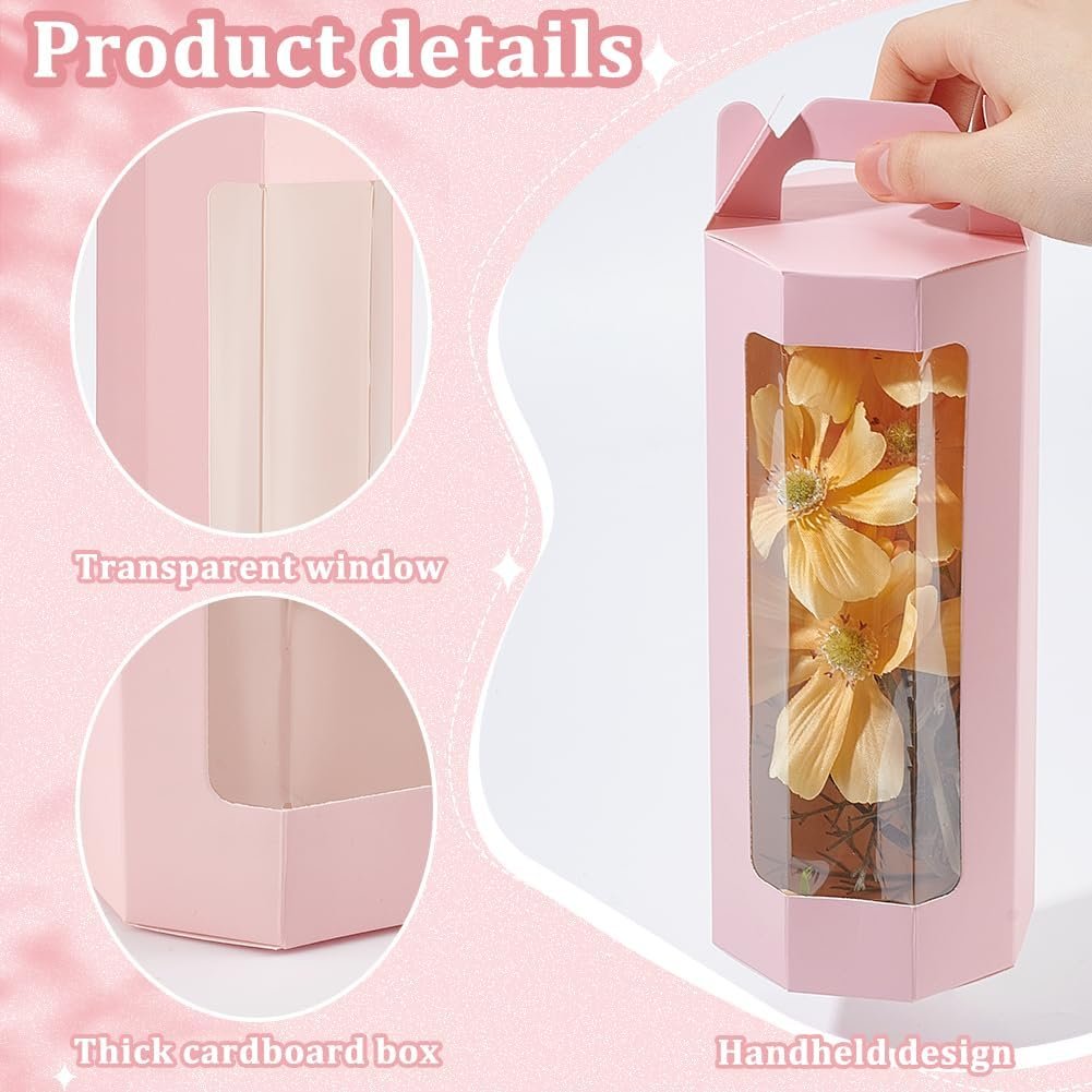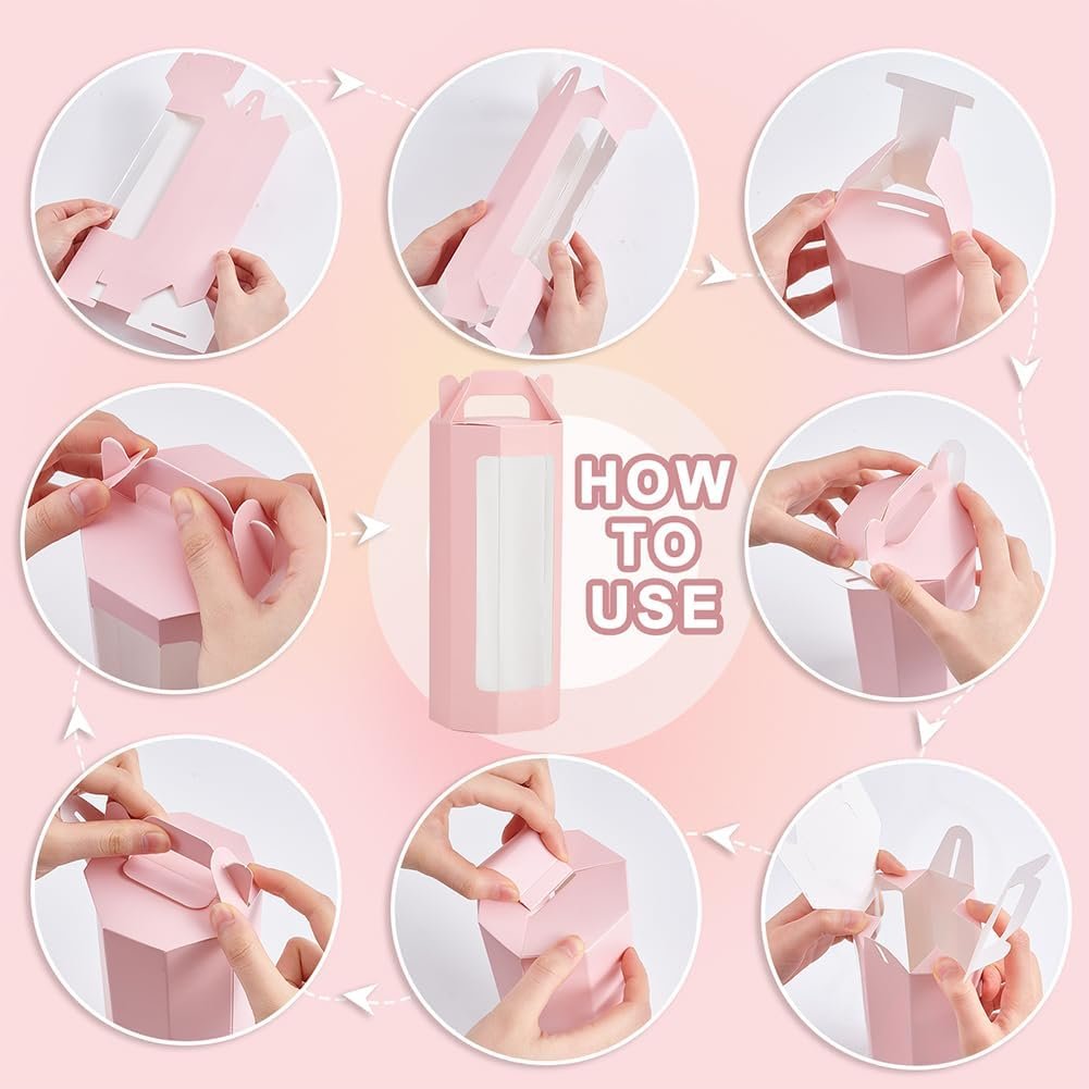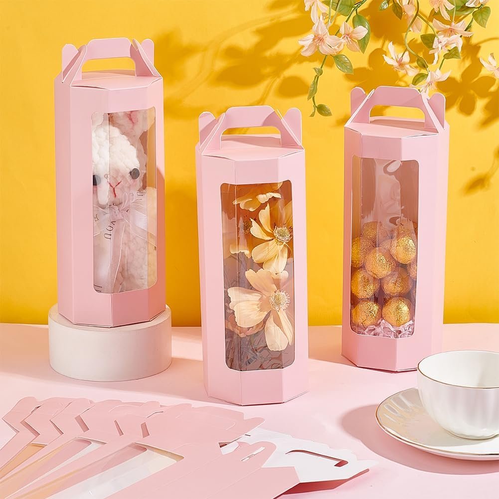 Pink Octagon Gift Boxes: package includes 10pcs pink kraft paper gift boxes, about 1.3 inch(3.5cm) wide, 3.4 inch(8.8cm) long, 9.6 inch(24.5cm) high. Unique three-dimensional octagonal shape makes them hold a variety of shaped items