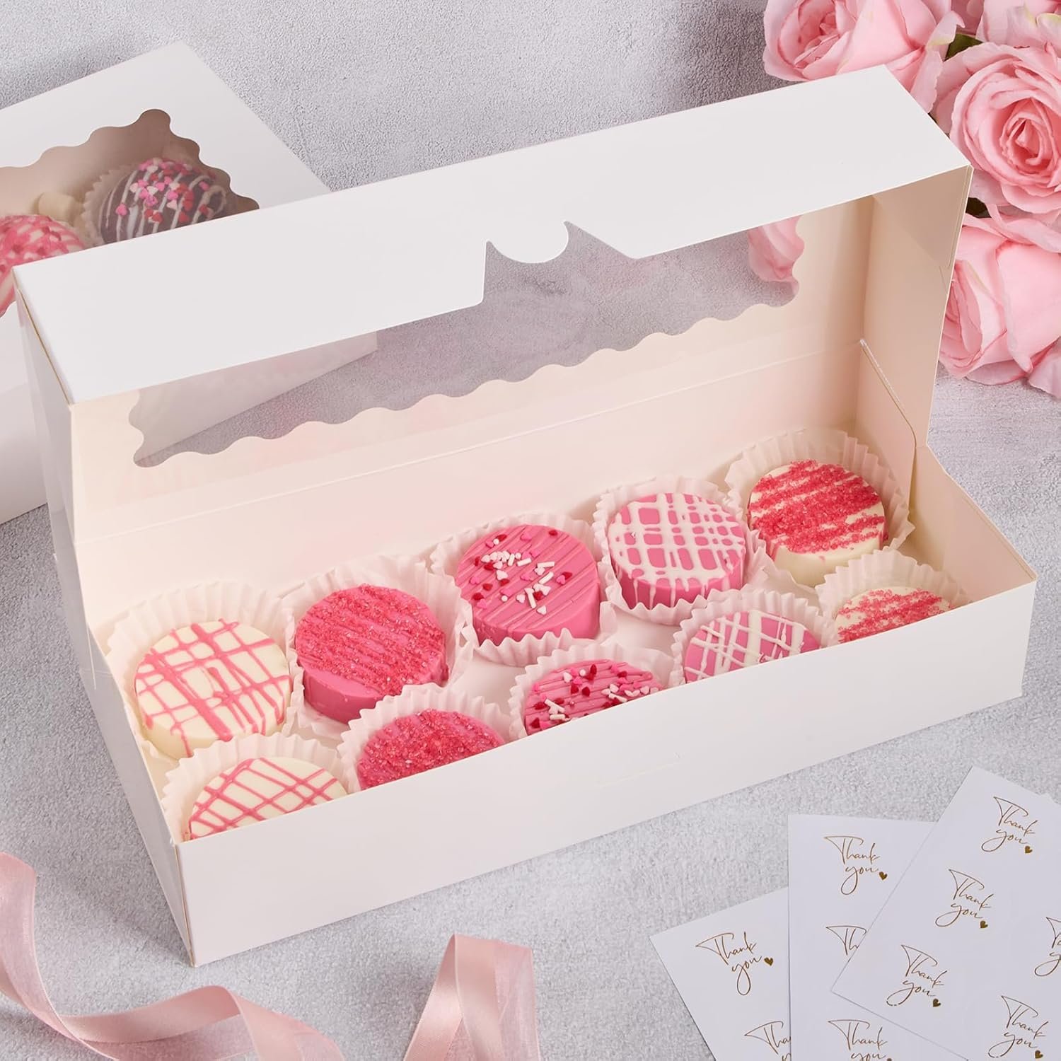 Wide Application: These 12.5" x 5.5" x 2.5" bakery boxes are ideal for 12-14 dipped strawberries, 8-12 sugar cookies, 8 cakesicles, 24 macarons, 12 cocoa bombs, mini cupcakes, donuts and other bakery goods