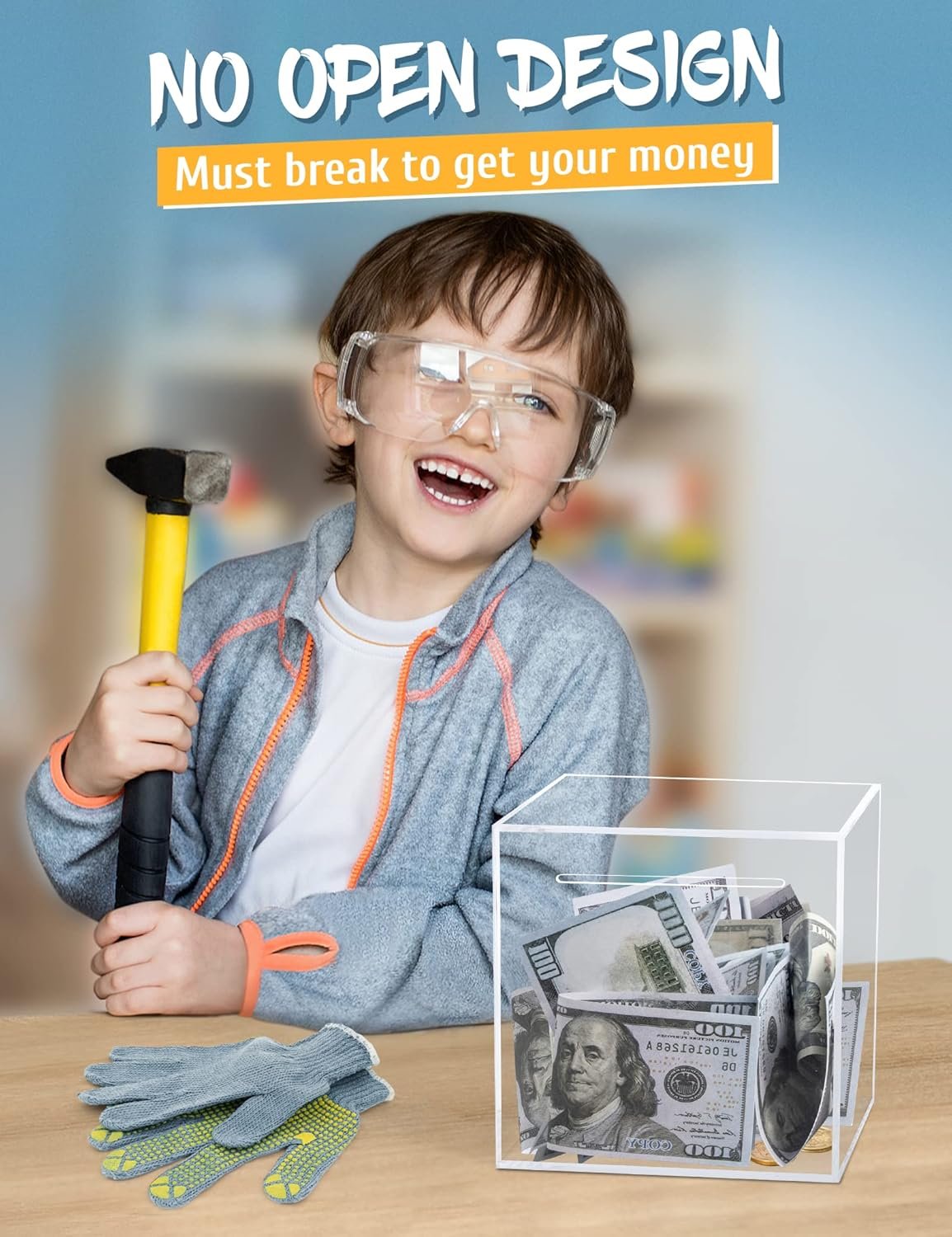 Unopenable Piggy Bank: The clear piggy bank for adults is made of premium acrylic material. You cannot easily take out your savings, and designed to must break to open, making it a safe and fun way to store money, making it easier to save