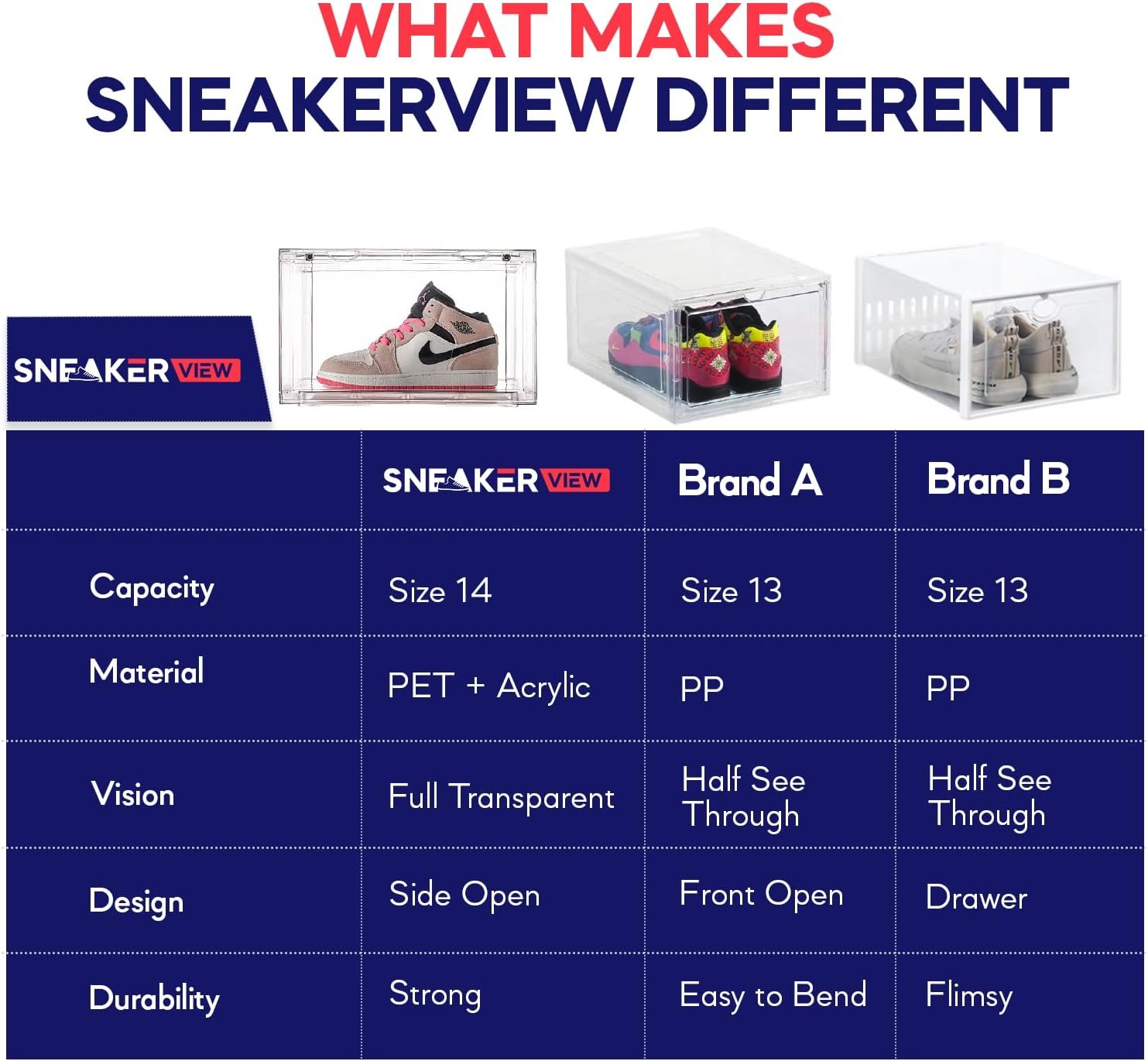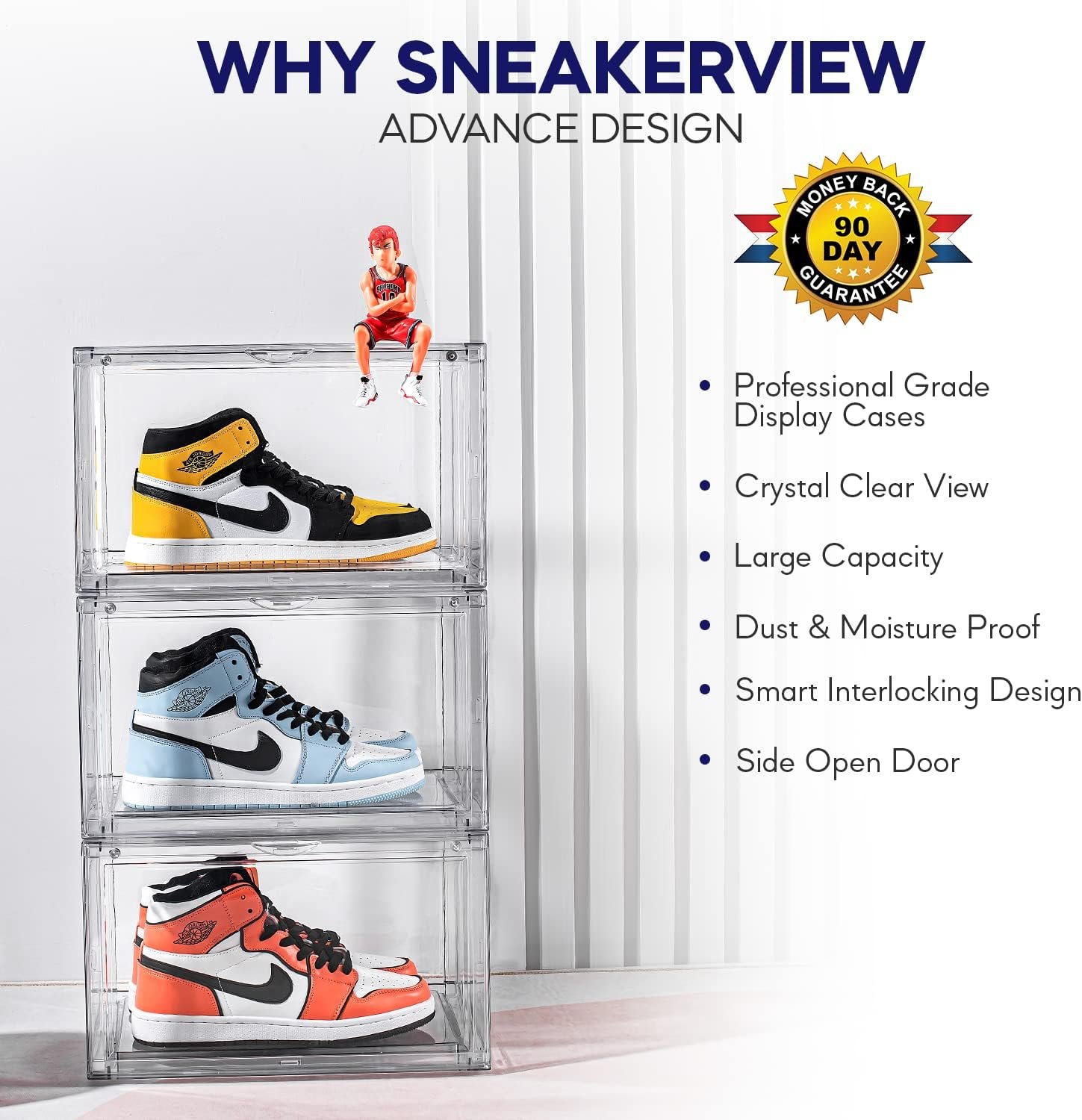 ✔ PREMIUM QUALITY- Are you tired of cheap flimsy plastic shoe box that won't last ? California based brand SNEAKERVIEW is born for true sneakerhead. Our 360°clear sneaker storage box is made of premium material that is 25% thicker than others.Each box weigh 4lb on its own. It provides a 360° clear view of your favorite shoes.The dust proof design better protect your collectibles item.