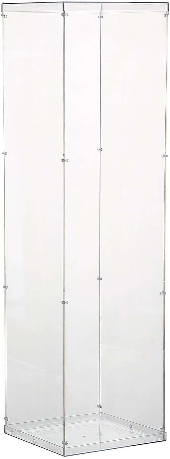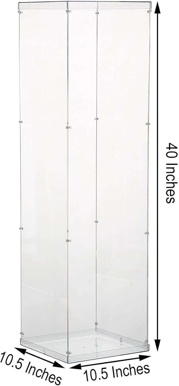 Quantity: 1 Set of Acrylic Display Box Material: Acrylic Plastic Color: Clear Overall Height: 39.5" Overall Width: 10.5" Lid Size: 11" L x 11" W x .75" lip Top and Bottom lids are interchangeable Panel Thickness: 1/8" Comes in 6 separate pieces Assembly Required: Yes Reusable, Collapsible, and Easy to clean