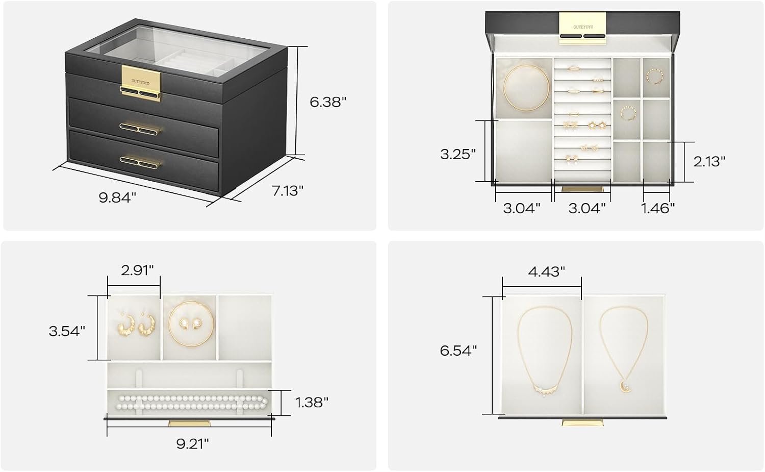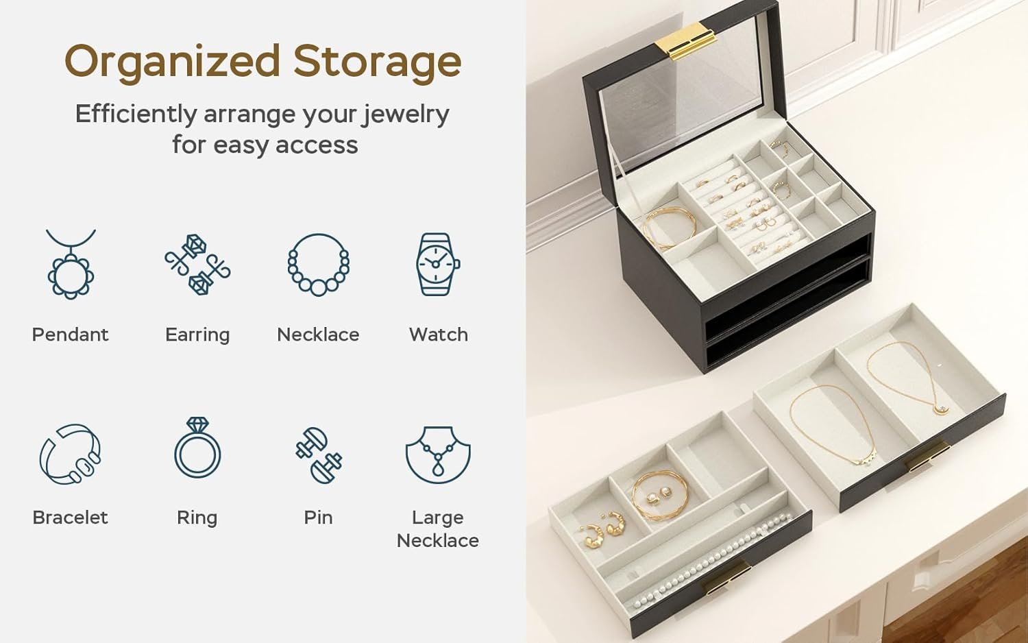 Multi-layer Storage Space: Jewelry box with three layers for organizing various jewelry sizes; top layer for small items like rings, earrings, and bracelets; removable compartments for custom storage; middle drawer for larger items; bottom drawer for large jewelry