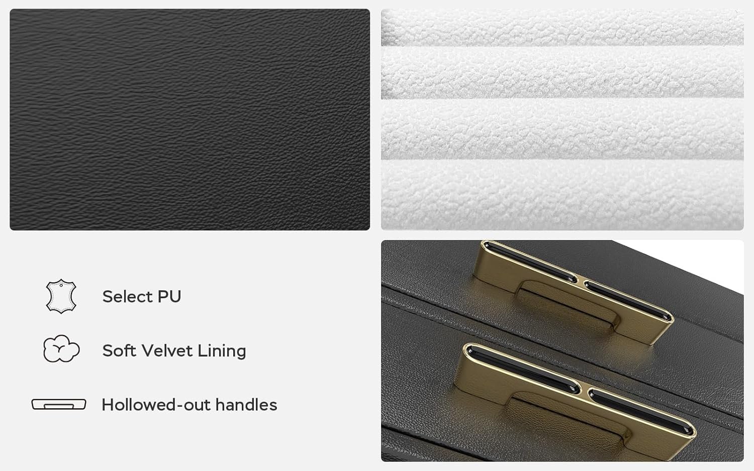 Premium Materials: Handcrafted jewelry box made of medium-density fiberboard; wrapped in moisture-resistant and wear-resistant PU leather; transparent acrylic window for easy jewelry selection; soft velvet lining protects against moisture and scratches