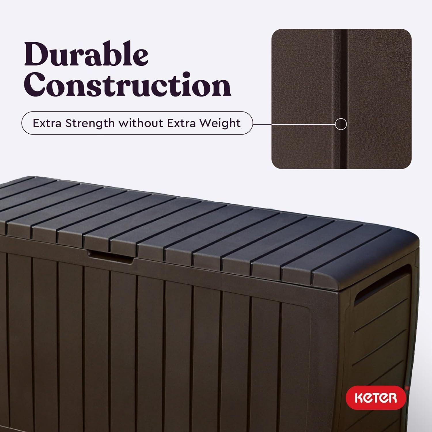 From flower planters to deck cushions, the Marvel storage box holds it all. Store your patio furniture pillows, garden tools, pool toolsand deck supplies neatly within the large 71-gallon capacity space. You can also place it indoors at the foot of the bed or in a play room to hold extra bedding, and seasonal clothing. Because of its durable construction, this storage box never buckles or expands no matter how much you store. This plastic storage box has built-in handles and rollers for easy mobility, and it only takes about five minutes to assemble with no tools required. Other benefits of the Keter Plastic box include: Dimensions: 45. 9 in. W x 15. 6 in. D x 22. 4 in. H Large storage capacity can hold up to 71 Gallons Durable polypropylene construction UV-resistant so it will not fade in the sun Never rusts, dents, or peels Complete with built-in handles so it is easy to move Keeps items dry and well ventilated Appealing decorative paneled design Ideal for both interior and exterior use