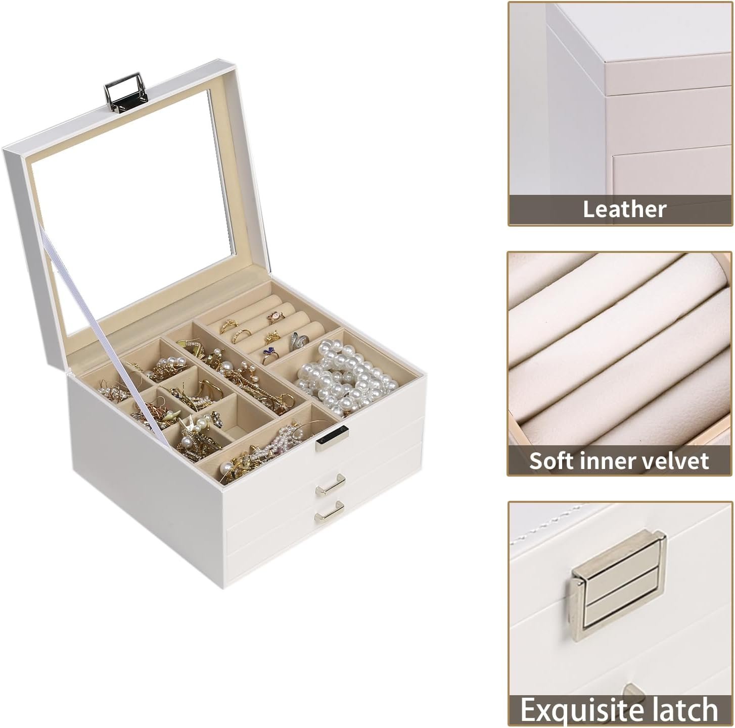 【Clear Lid Jewelry Box】 The organizer has expanded to 9.05 x 7.9 x 5.4 inches. The organizer of this dresser upgrades the feature zoning to make the most of every place to store your rings, necklaces, bracelets, earrings, pendants, hairpins, watches and other gadgets. This girl's jewelry box is reasonably constructed and sturdy to keep all your jewelry in order.