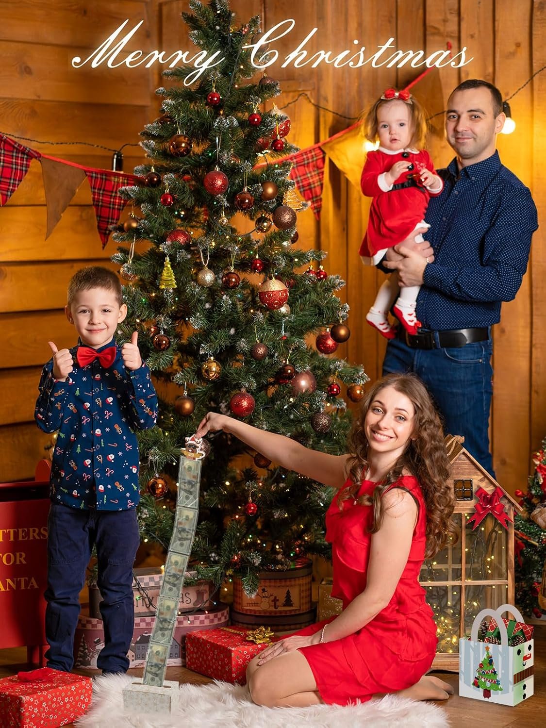 🎄 Easy to Assemble: You just need to put the cash in the self adhesive transparent bags, use clear tape to connect each clear bag, then roll them up and put them into the box, use the pull out the card to pass through the gap at the top of the money box, and you just need to pull it gently and the money will come out .