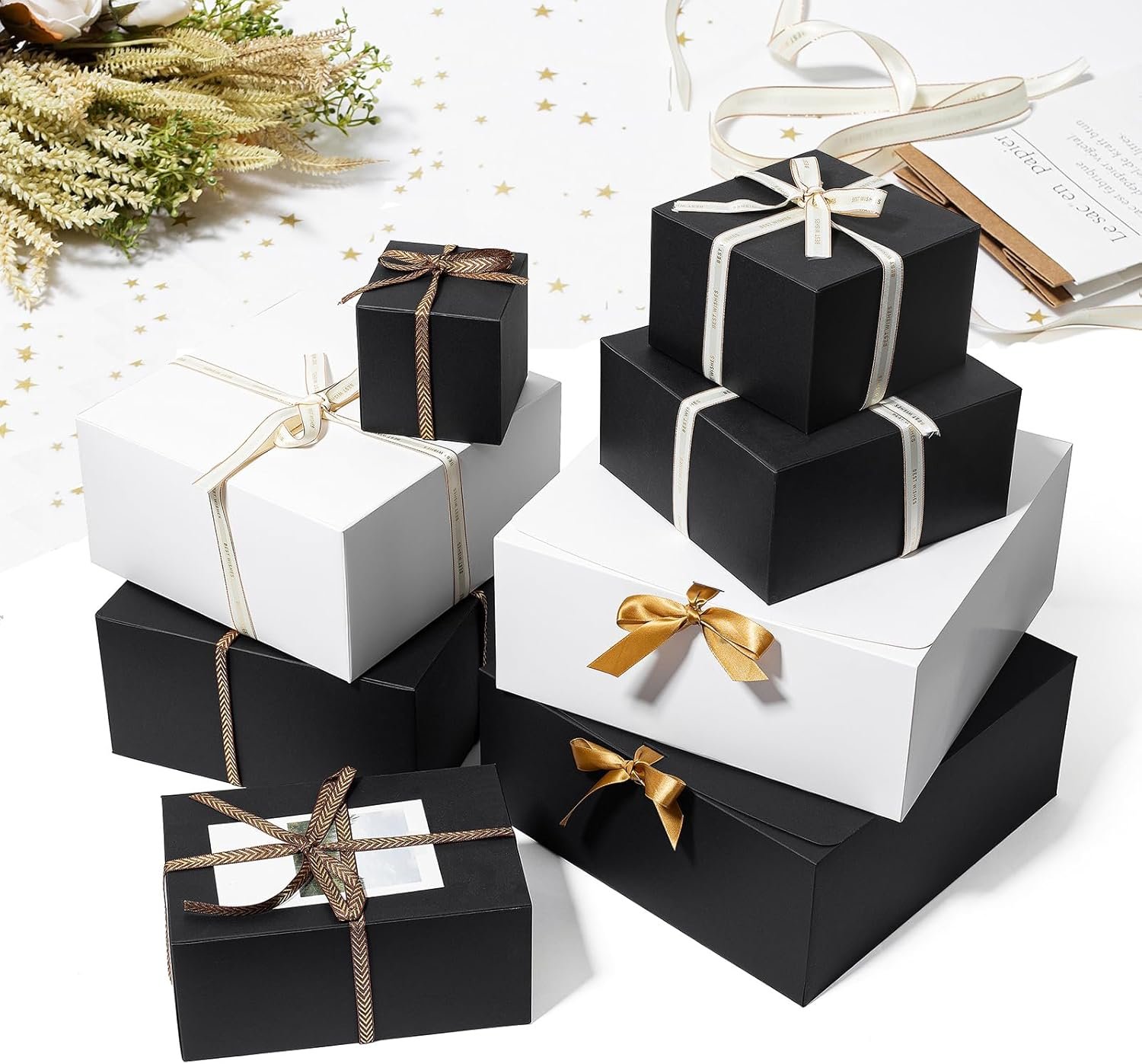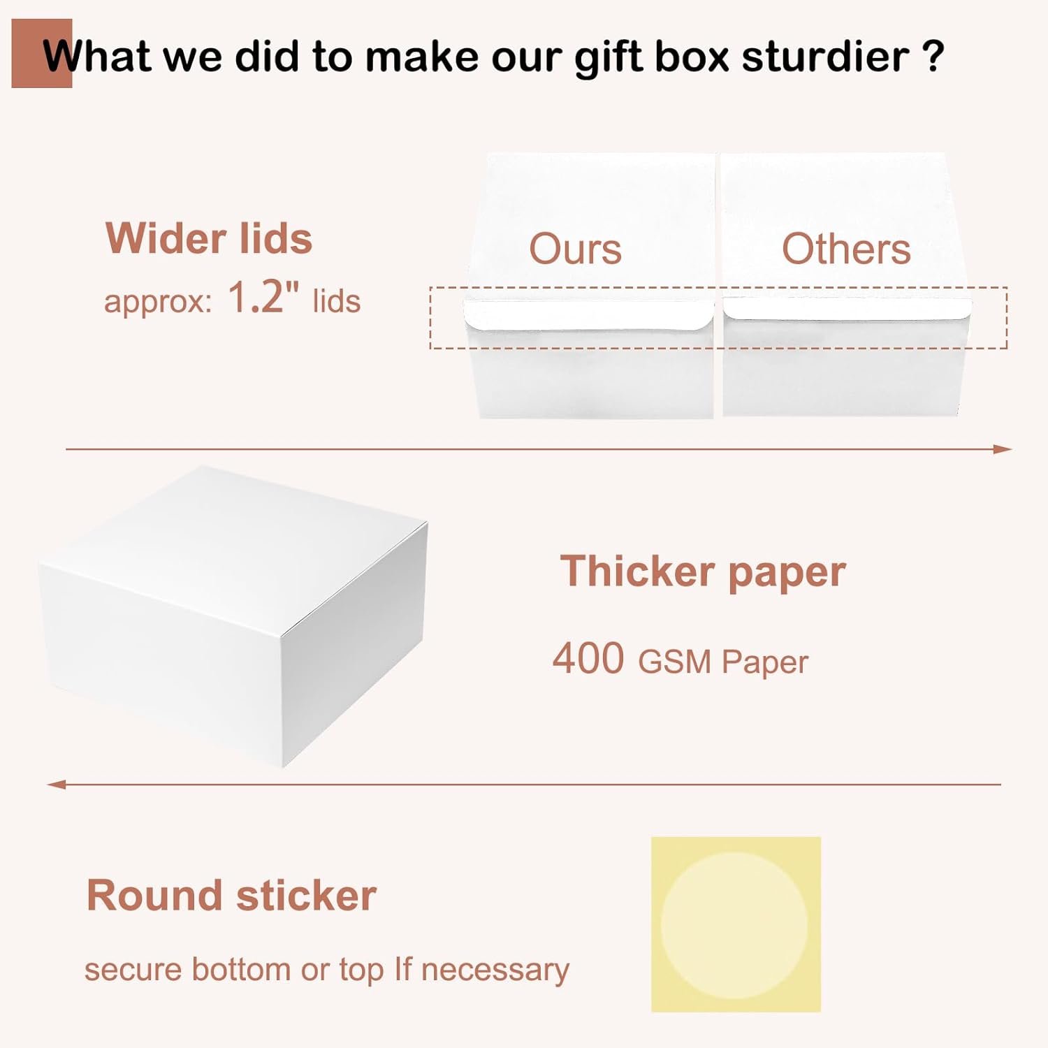 400 gsm Sturdy Boxes: Made of 400 gsm recycled white paperboard, more thicker than others. About 1.2 inch wide lids on top and buttom, makes the box square and firm, also the bottom can get more support. Sturdy enough to hold presents like small bottle of wine, clothes, T shirt, mugs, wine glasses, cups, tumblers, mason jar, candles, snacks, perfumes, makeup, wallet.