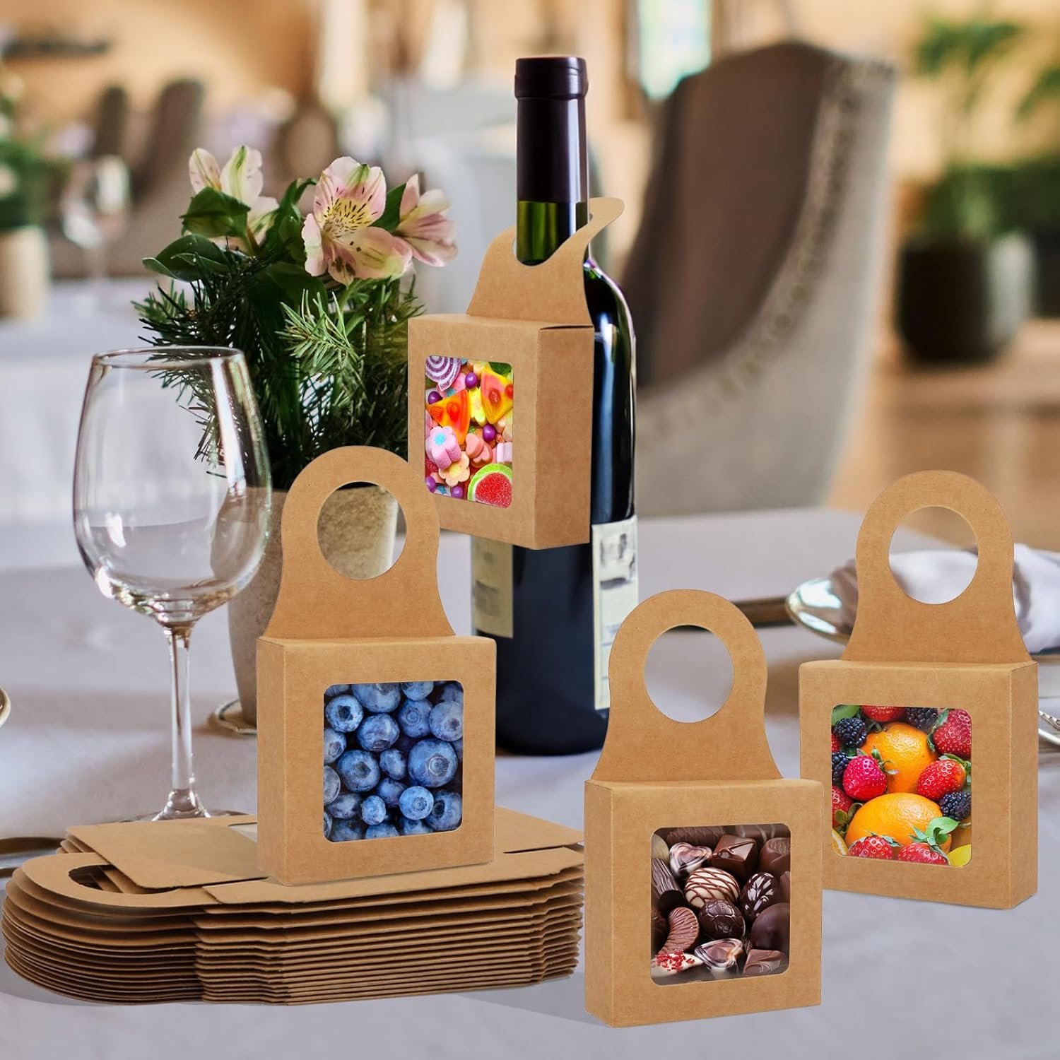 Foldable storage design: The cowhide paper wine bottle box with a tile design is effortlessly storable, space-saving, and simple to assemble. Once assembled, simply pack this bottle hanger favor box with your gifts or food, then hang it on the wine bottle.