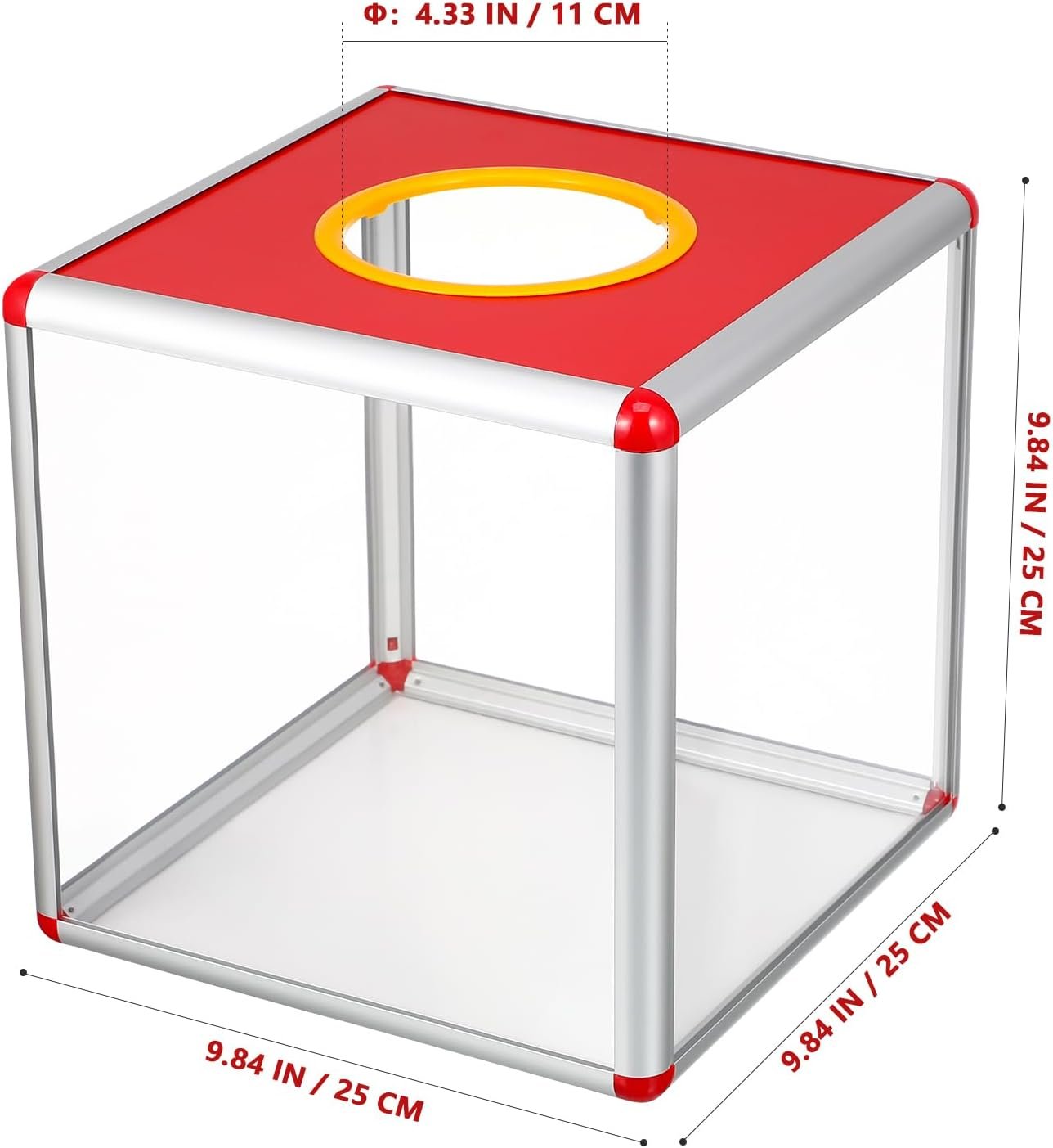 Ballot storage container: The size of this raffle box is 9.82X9.82X9.82in/25X25X25cm, which is large enough to meet your use needs