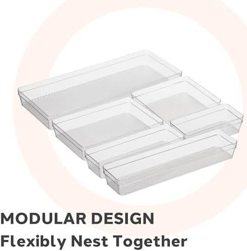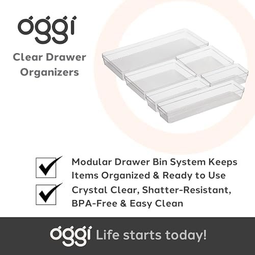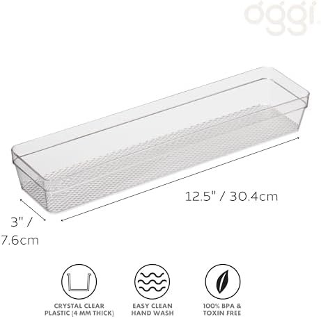 OGGI's Drawer Organizers are customizable, convenient, and affordable organization and storage bins to keep your drawers tidy. Declutter crowded drawers or countertops with our storage drawer organizer. They are great kitchen drawer organizers. for silverware, cooking utensils, and baking accessories. There are multiple sizes of organization bins available which give you the opportunity to mix and match sizes to modify and customize the fit. The BPA free plastic organizer bins are sturdy and easy to clean. Simply wipe out any crumbs or spills with a damp cloth. These organizing bins will solve your organization and storage needs in any room, not just the kitchen. Ideal as bathroom organization for makeup, toiletries, and more. They are also perfect as a desk storage organizer to keep your office tidy.