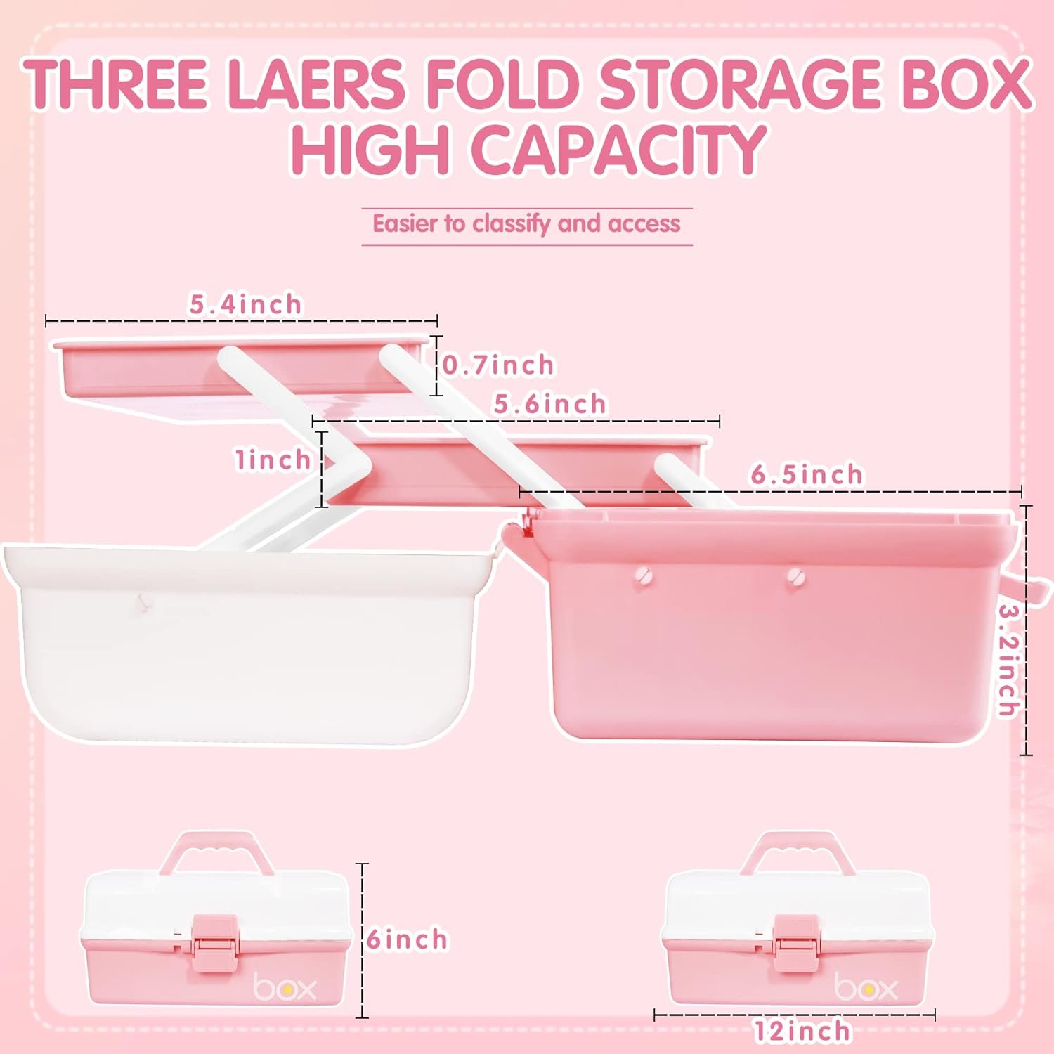 Enough Capacity: 12" storage organizer box size: 12" x 7" x 6", build in 3 layers with 2 trays, each tray also has compartments, which perfectly help to arrange items and this zone is enough to orderly store kids toys DIY crafts, sewing staffs etc.