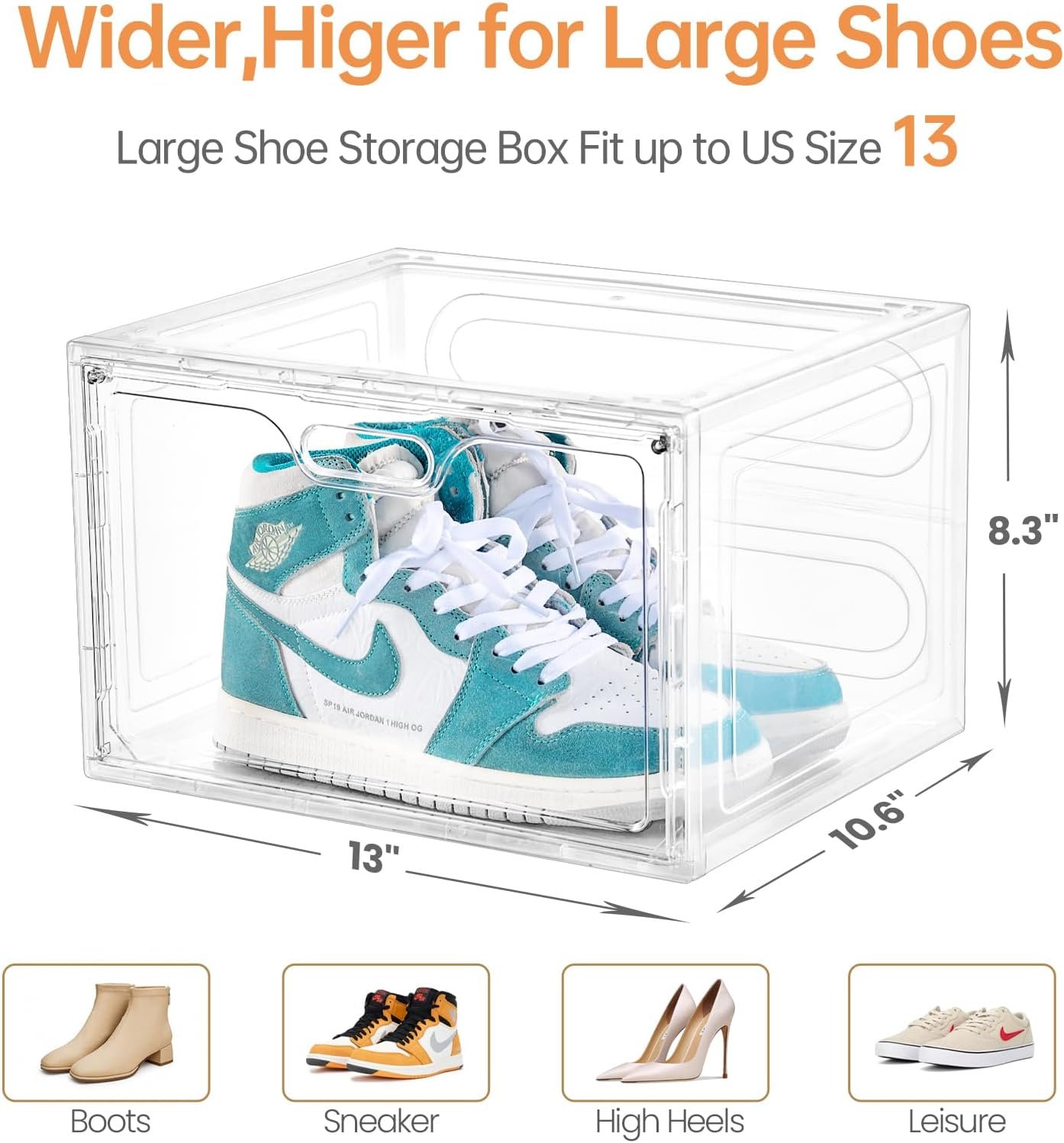 [Extra Large Capacity]13.4’’L*10.6”W*8.3”H-The upgraded large shoe display boxes are suitable for US shoe size up to 13,which designed with a larger storage capacity.So don’t worry about the shoe boxes space. The shoe display case can keep your messy shoes well organized.which is suitable for many types of shoes such as boots, leisure, sneakers and high heels.