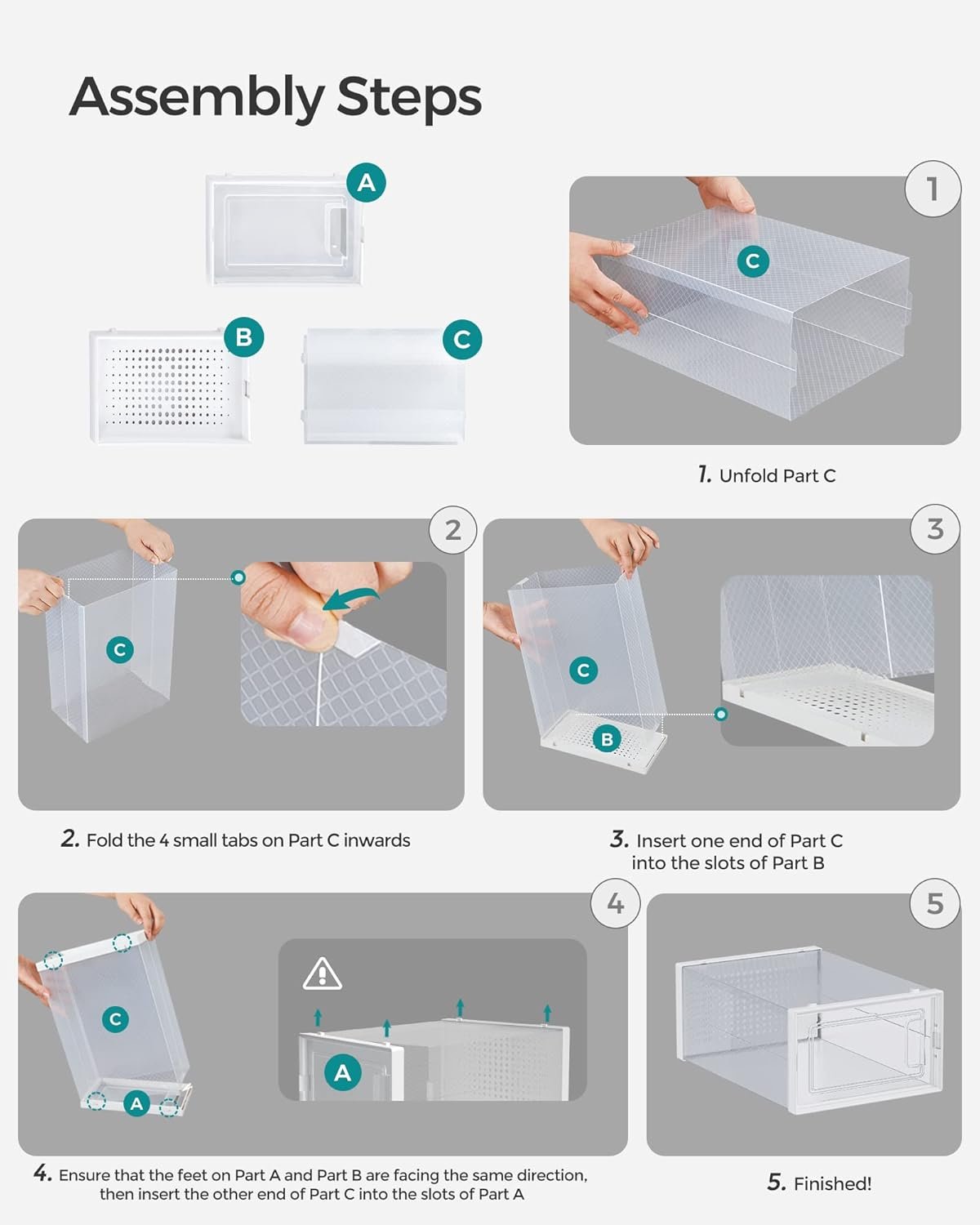 [Easy Assembly] Each box comes in 3 parts, simply slot them together by following the instructions, that’s it! Sneakers, heels, or flats? Throw them in, these shoe organizers have an inner size of 9.6”L x 12.8”W x 7”H and can hold up to US shoe size 13