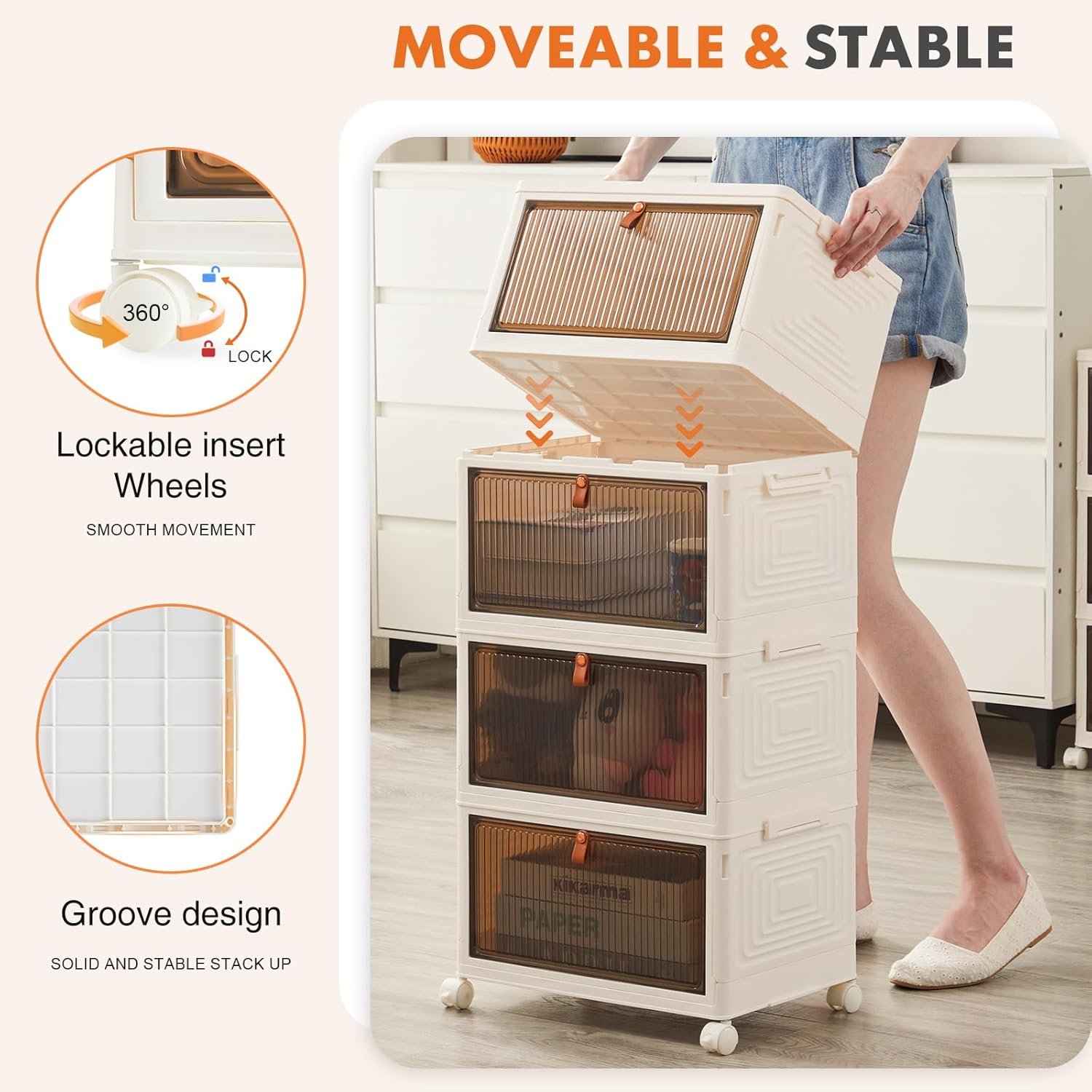 【Stackable & Removable】Each box has buckles on both sides to fix double tiers at the same time. The top and bottom of each layer have special deep grooves, so that the whole can be stably stacked together without tilting or tipping over; The four rotating wheels at the bottom can move smoothly and won't scratch the floor. Lockable wheels can be manually adjusted to be fixed in a certain place.