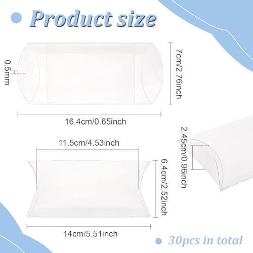 【Package Includes】: 30pcs plastic pillow favor box, with protect film, great tactile, can prevent scratching and protect the product. Please remove the protective film before use.
