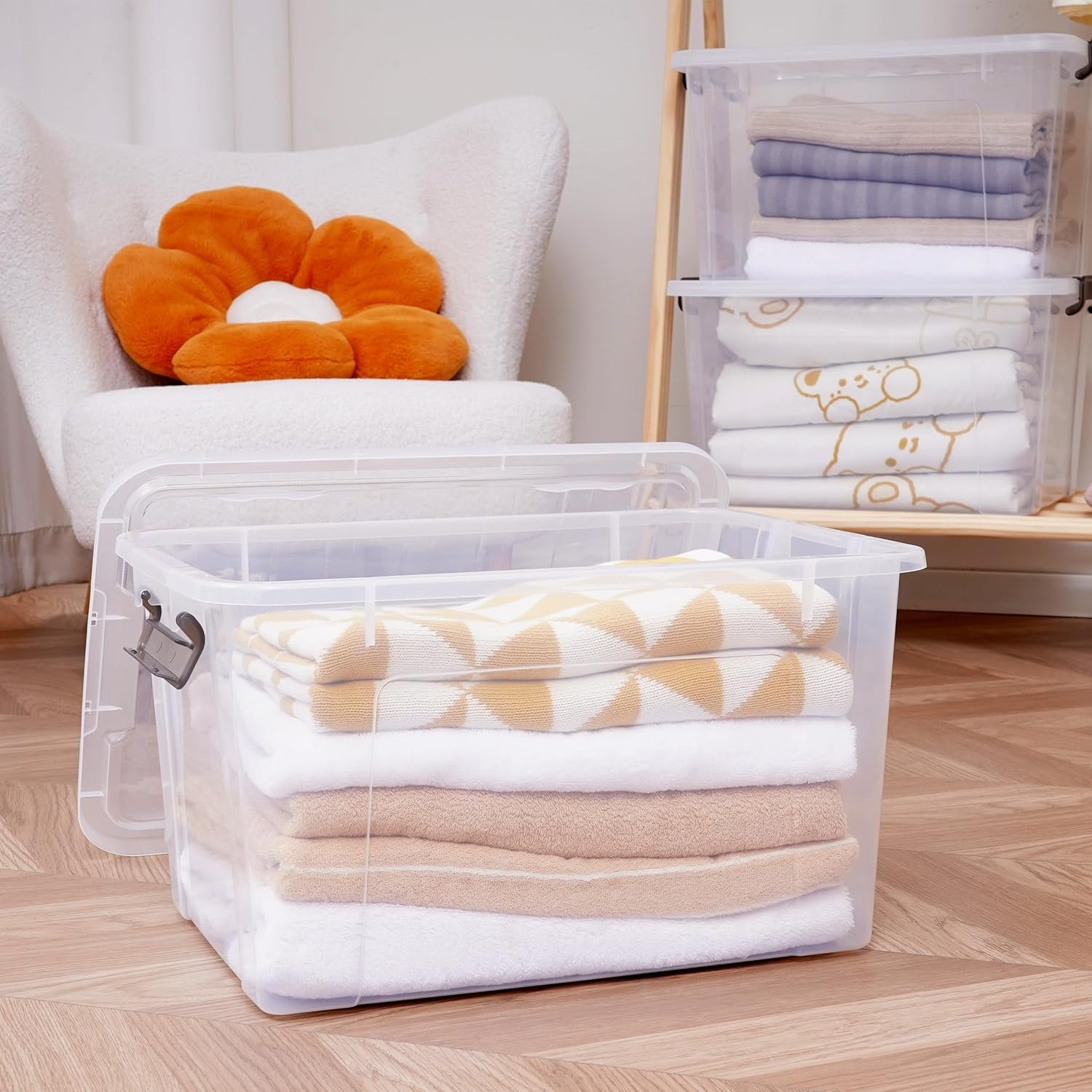 【44.4-quart Capacity】Package includes 2 containers for organizing, single measuring 20.63"L * 15.12"W * 11.73"H, capacity 44.4 QT. Perfect for large storage needs in the closet, garage, bedroom, basement, camping, office, etc;