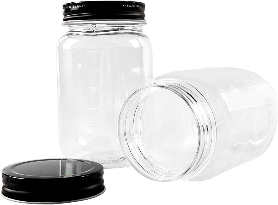 1. Noveinks 16 OZ CLEAR PLASTIC JAR : The package includes 20 pack 16 oz clear plastic jars with black metal lids; PLASTIC Jar Product measures 2.8 Inches Diameter, 5.3 Inches Height
