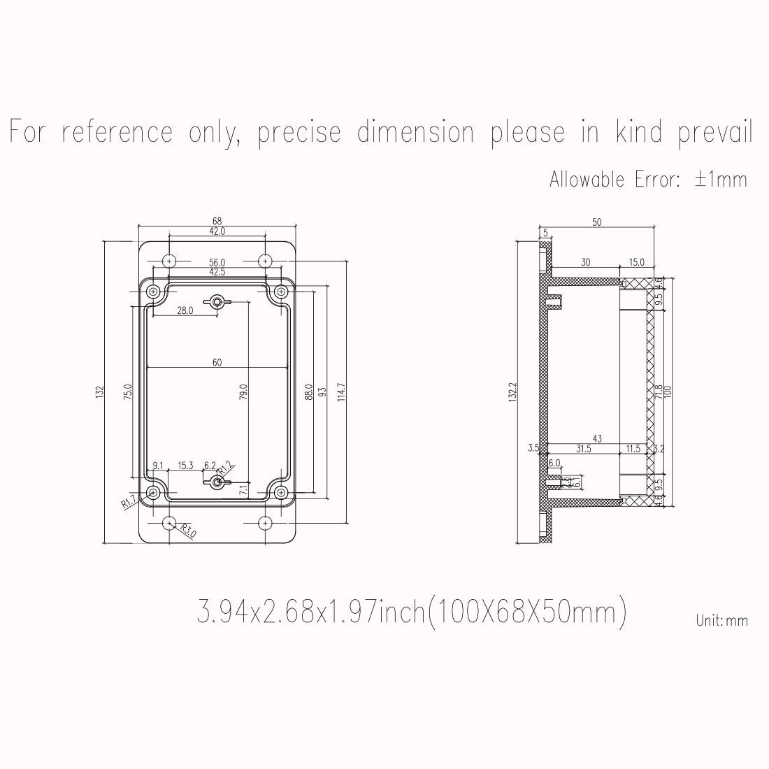 Outer Size of project enclosure: 3.94" x 2.68" x 1.97"(100X68X50mm)(L*W*H); Inner Size of electronic enclosure: 3.7" x 2.4" x 1.7"(93X60X42mm)(L*W*H)- - (Allowable Error: ±2mm)