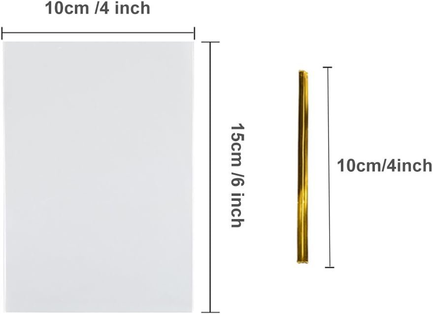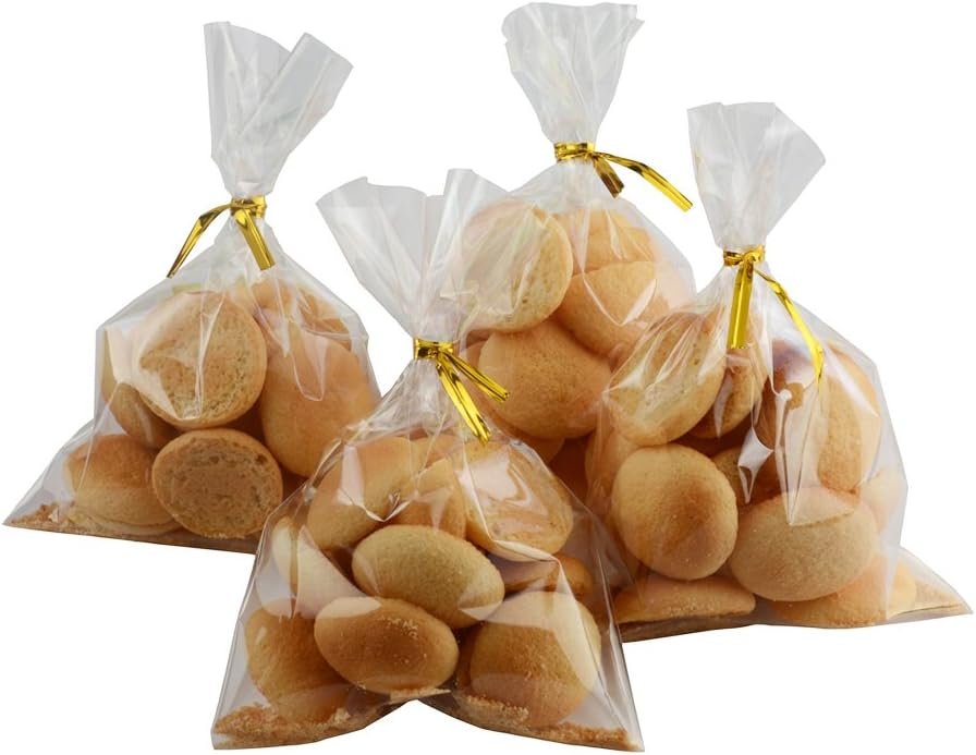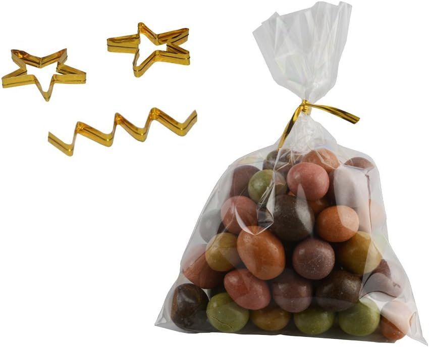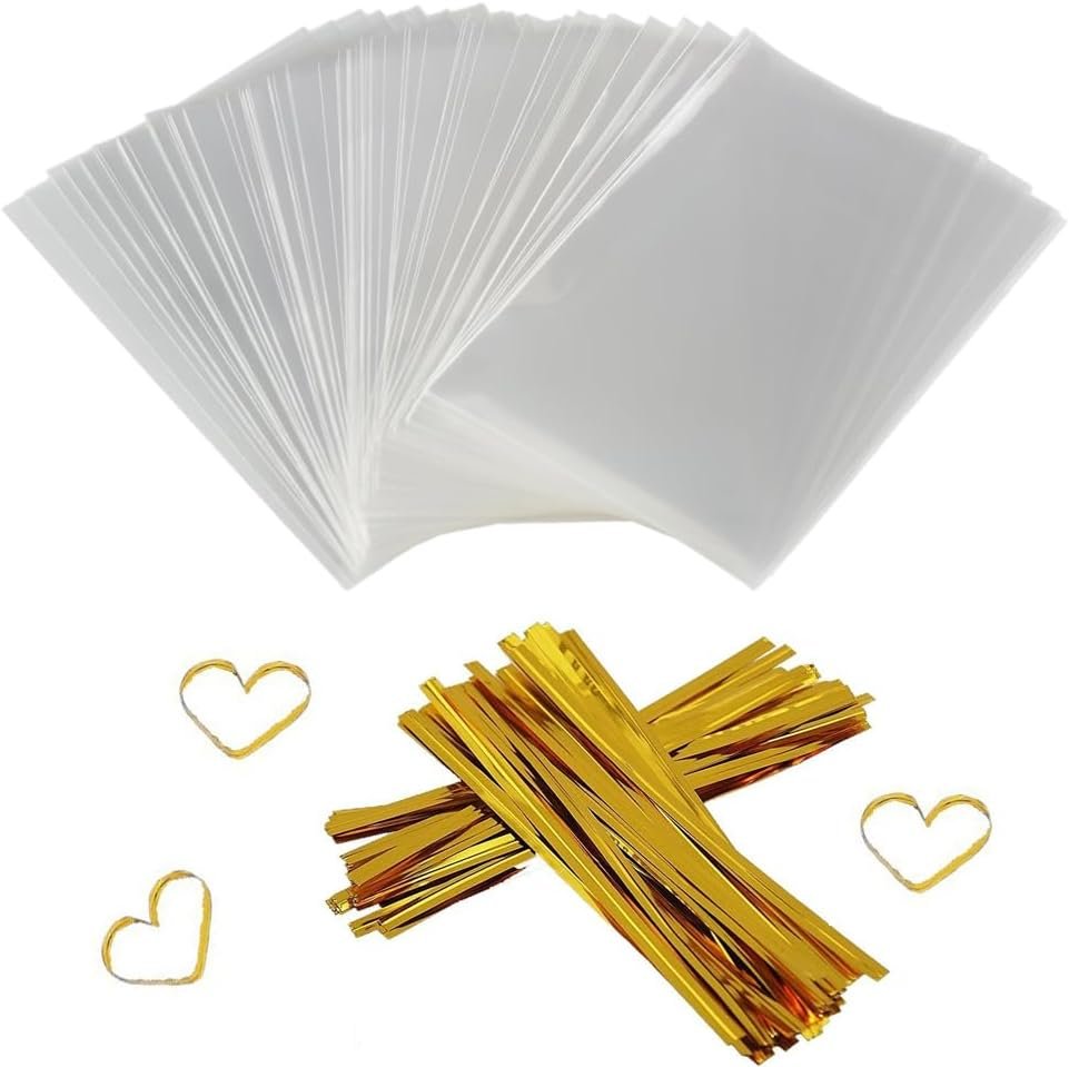 Clear cellophane treat bag: Flat bag, 4 inch by 6 inch; with 200 PCS Metallic twist ties: Gold, 3mm*100mm