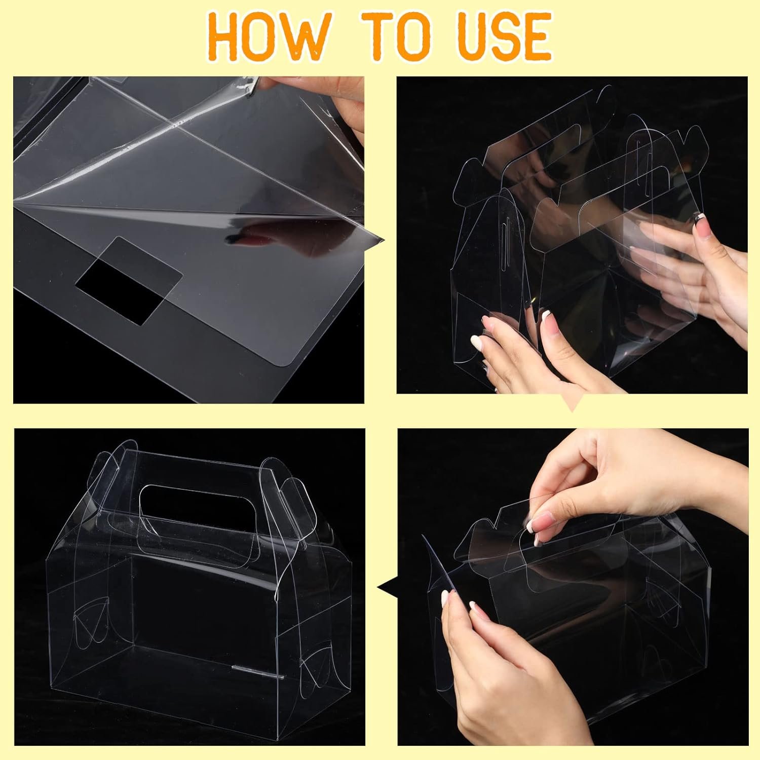 Easy to Assemble: the clear gift box comes in flat to avoid breakage during transportation, and it only takes a few seconds to have a fully formed box (please refer to the picture for specific steps); You can easily fold the box along the line, and then put dessert or goodies into the box, which is simple and easy; When not in use, it can be unpacked and flattened for convenient storage