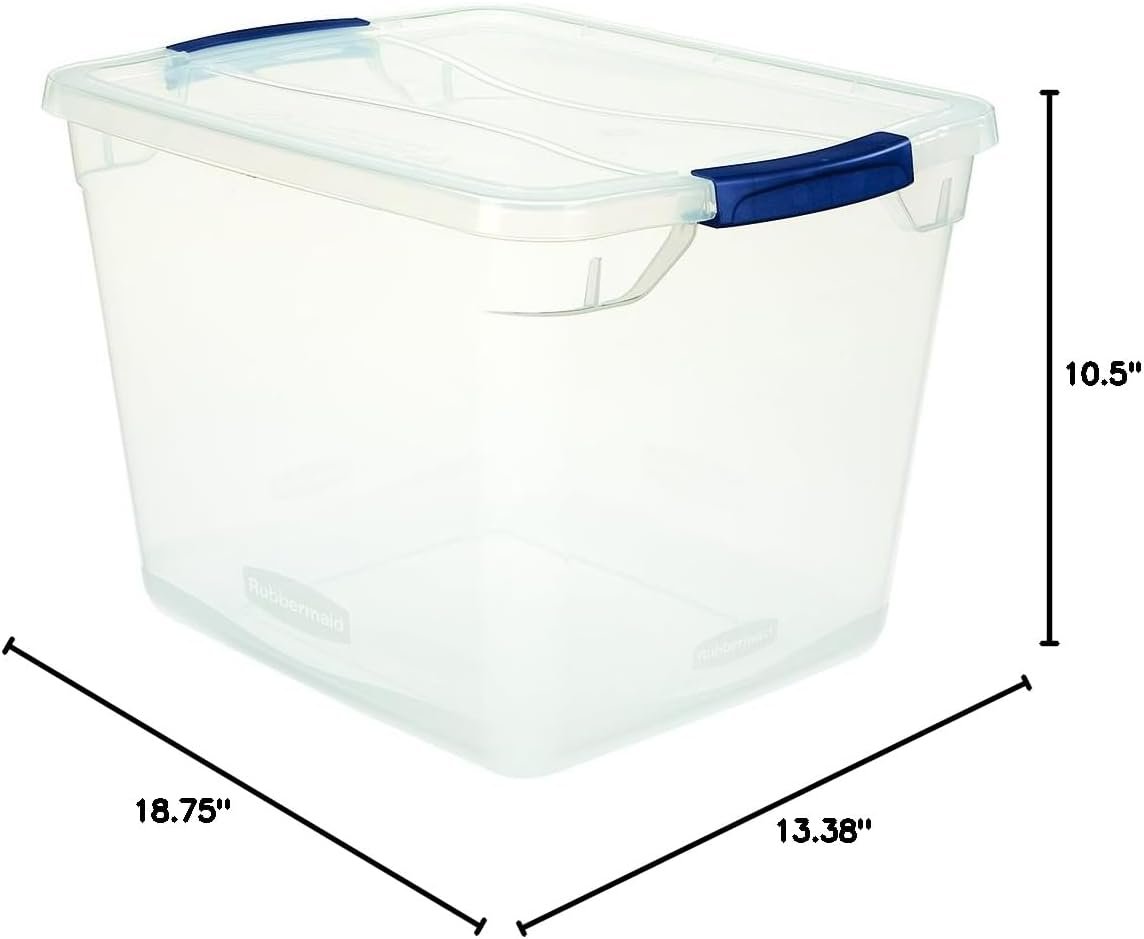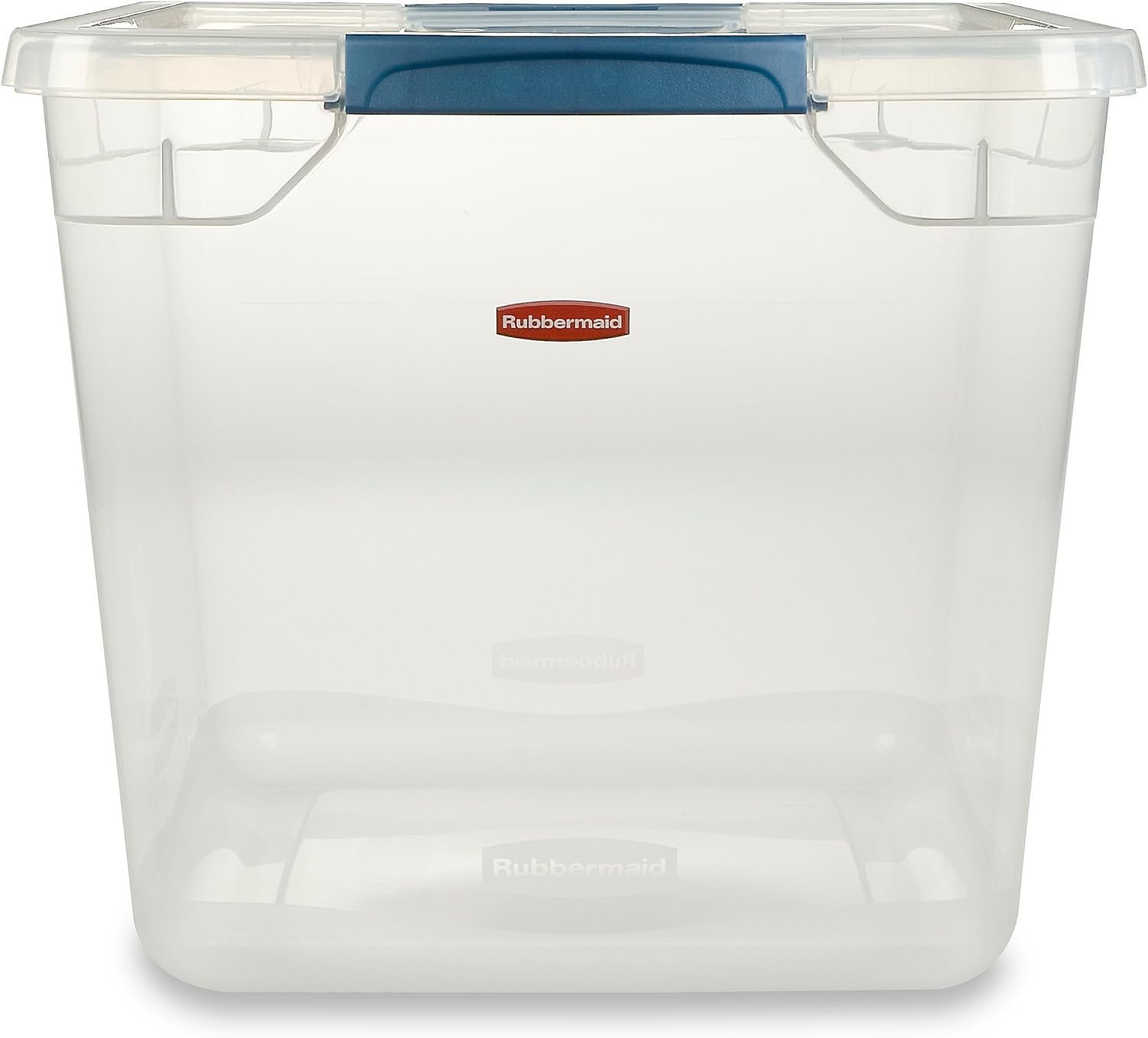 Straight wall design maximizes storage space holding up to 14-Percent more than other containers in the same space. Recessed lid construction ensures superior stacking. New sleek texture gives containers a modern look. Space-Efficient design allows the containers to fit into more spaces in your home. Latches hold lid on securely. Made from durable, shatter-resistant polypropylene to keep contents contained, dry and dust-free. Made in the USA. Rubbermaid clever store latching storage tote container, clear, 30-quart (fg3q2500clmcb).