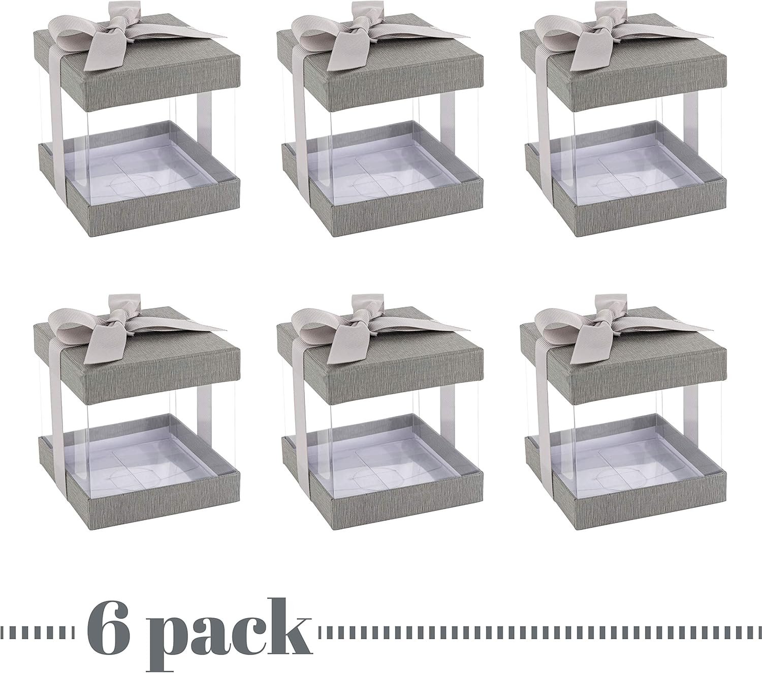 TRANSPARENT GIFT BOX: Unique and attractive way to pack your gift for your loved ones by displaying whatâs inside, improving products attractiveness by using these clear gift boxes; no wrapping needed, ditch the standard gift wrapping paper PREMIUM QUALITY: Transparent Gift Boxes are quite easy and convenient as it comes flat and made out of a finest quality paper material, DIY ready solid box for arts & crafts and these are sturdy enough to hold a fair amount of weight GREAT FOR GIFTS: Perfect gift wrap solution for small gifts, such as tiny wedding favors, beauty products, cookies, brownies, snacks, muffins or small cakes in these boxes to give as gifts; each box will keep your delicacies safe and looking good PACKAGE INCLUDES: Set of 6 boxes have dimensions of 4â x 4â x 4â; these party favors candy boxes are also available in six different colors along with cardboard lid, base and matching ribbon, which is perfect and ready to gift your loves ones SATISFACTION GUARANTEED: We are confident you will love our clear gift boxes. You can be confident in buying it, as all Hammont products are made of best materials, at the most reasonable prices for our customers!