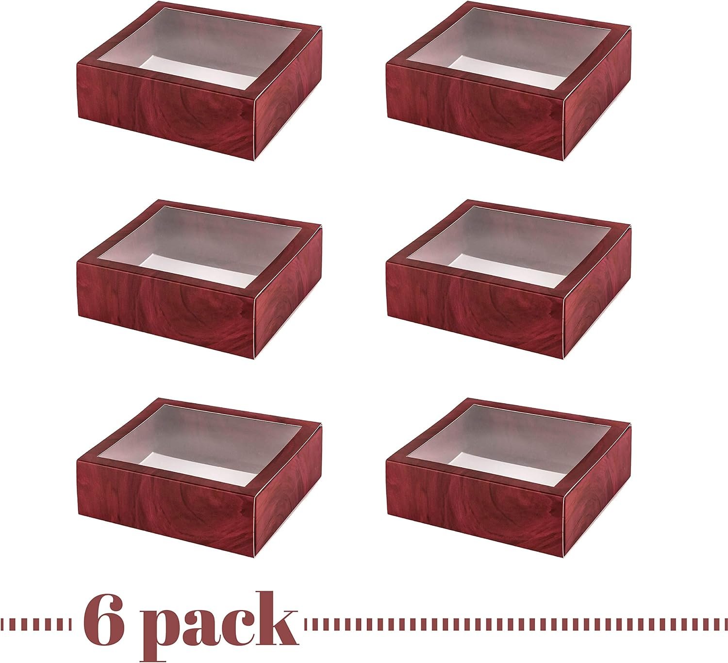 CLEAR WINDOW GIFT BOX: Great way to pack your gift for your loved ones in an attractive way by displaying whatâs inside, improving products attractiveness by using these gift boxes with clear PVC wrap; no wrapping needed, ditch the standard gift wrapping paper PREMIUM QUALITY: Paper Gift Boxes are quite easy and convenient as it comes flat and made out of a lightweight cardboard paper material, DIY ready solid box for arts & crafts that can be decorated with stickers GREAT FOR GIFTS: Perfect gift wrap solution for small gifts, such as cookies, brownies, snacks, muffins or small cakes in these boxes to give as gifts; each box will keep your delicacies safe and looking good PACKAGE INCLUDES: Set of 6 window boxes have dimensions of 6â x 6â x 2â; these party favors candy boxes are also available in six different colors along with clear window, which is perfect and ready to gift you loves ones SATISFACTION GUARANTEED: We are confident you will love our clear window gift boxes. You can be confident in buying it, as all Hammont products are made of best materials, at the most reasonable prices for our customers!