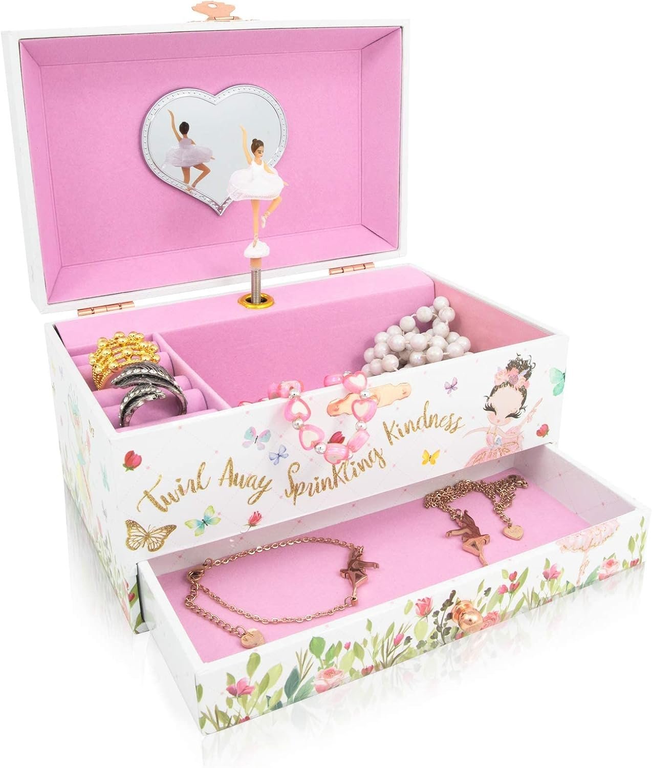 EASY TO USE & STORE - Our little girls jewelry box is the perfect size to fit on any shelf. To get the music playing (and the ballerina spinning), just twist the lever on the back and open the box.
