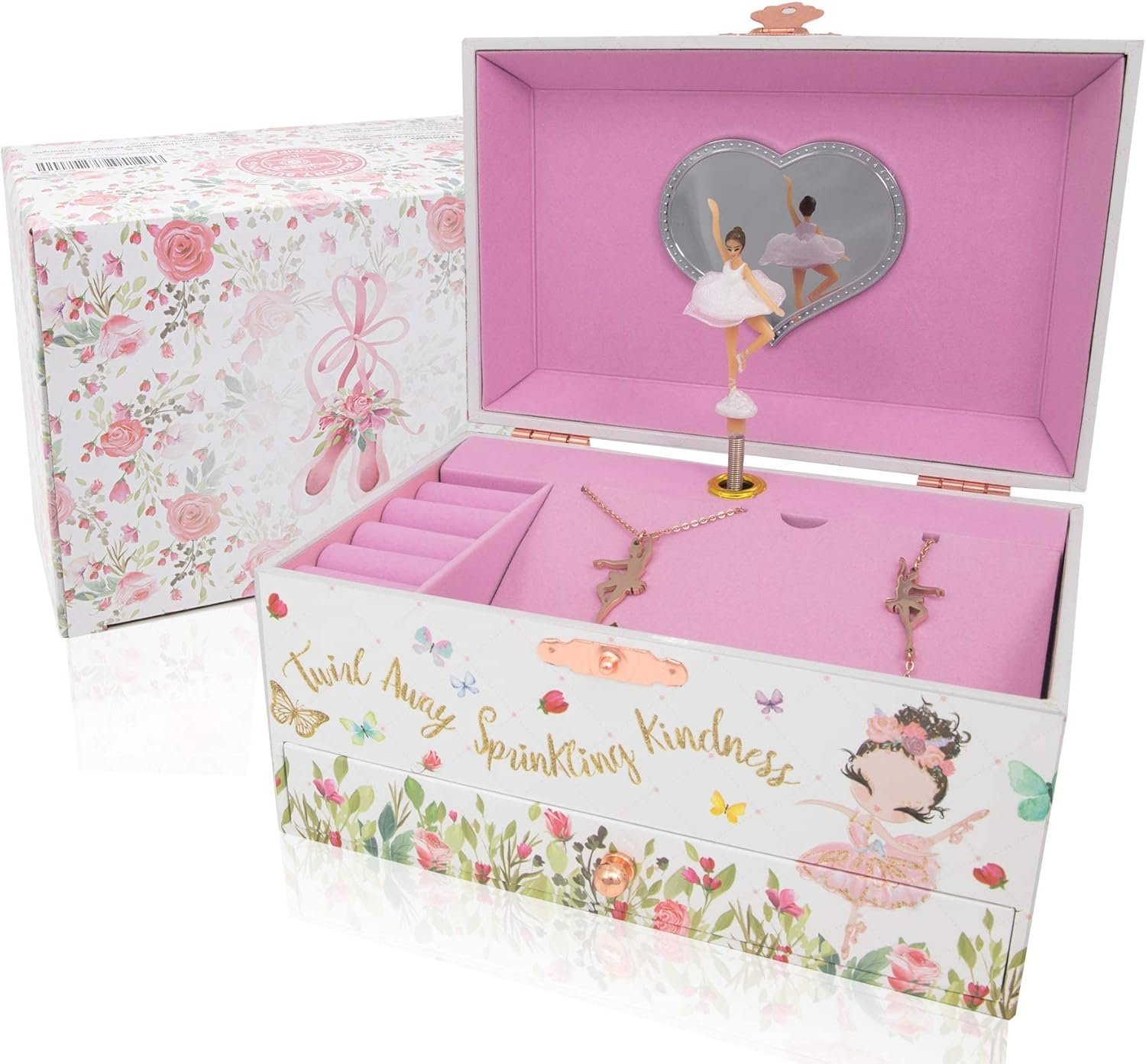 ADDED JEWELRY - This kids jewelry box isn't the only gift in this package! There's an included pink ballerina bracelet and necklace set that fit perfectly inside the box.